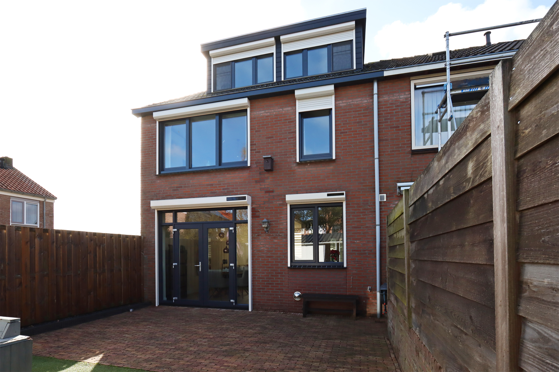Buiten: Bestrate voortuin. De, op het noordwesten gesitueerde, achtertuin is geheel omsloten door tuinschermen waardoor deze veel privacy biedt. De tuin heeft een groot bestraat terras, kunstgras en vrijstaande stenen berging met aansluitend overdekte achterom.