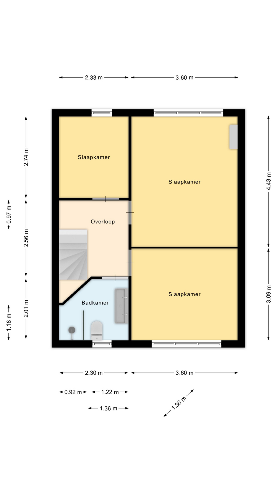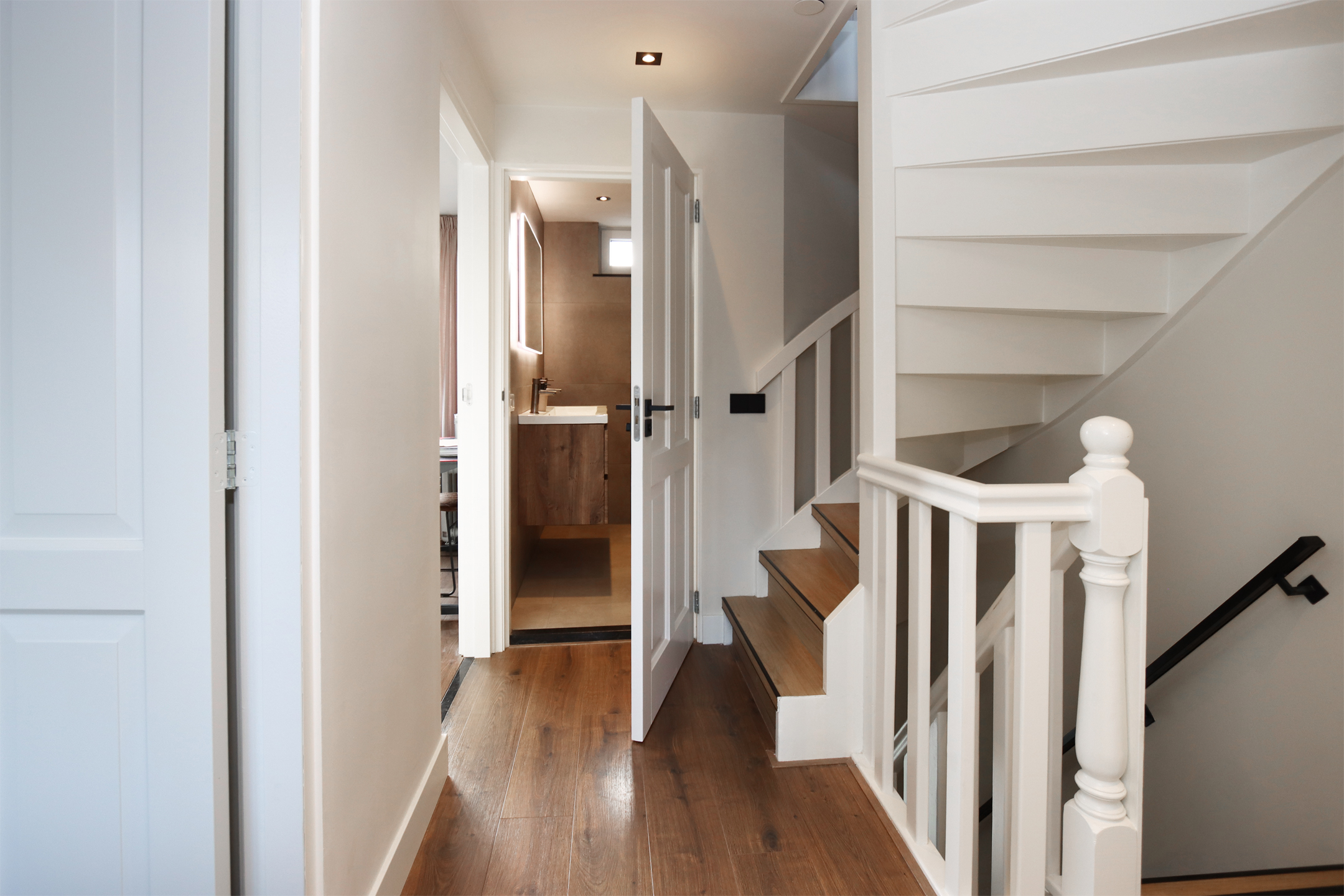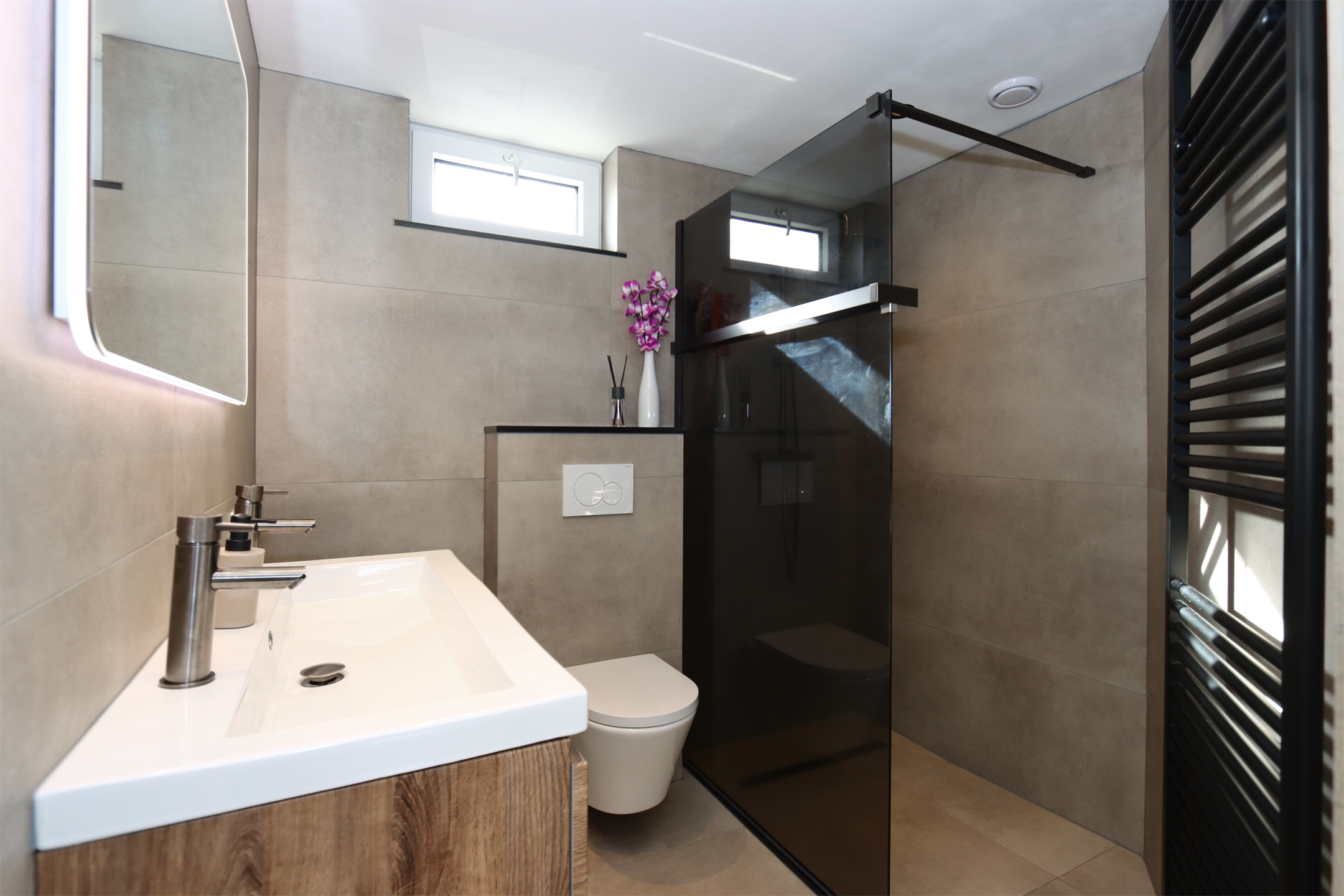 Eerste verdieping: Ruime overloop. Drie slaapkamers, waaronder twee ruime slaapkamers. Moderne badkamer met wastafelmeubel, wandcloset en inloopdouche.