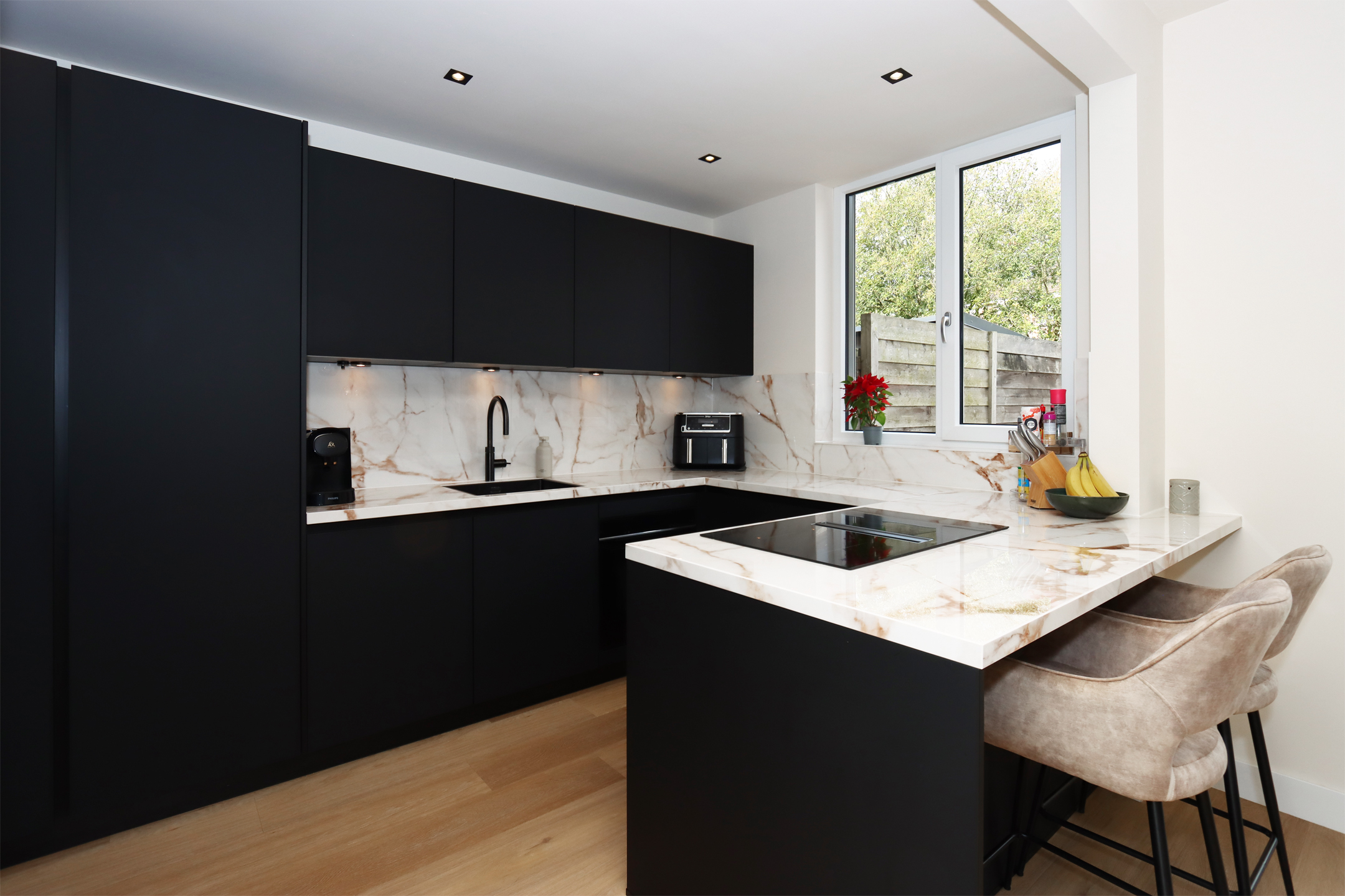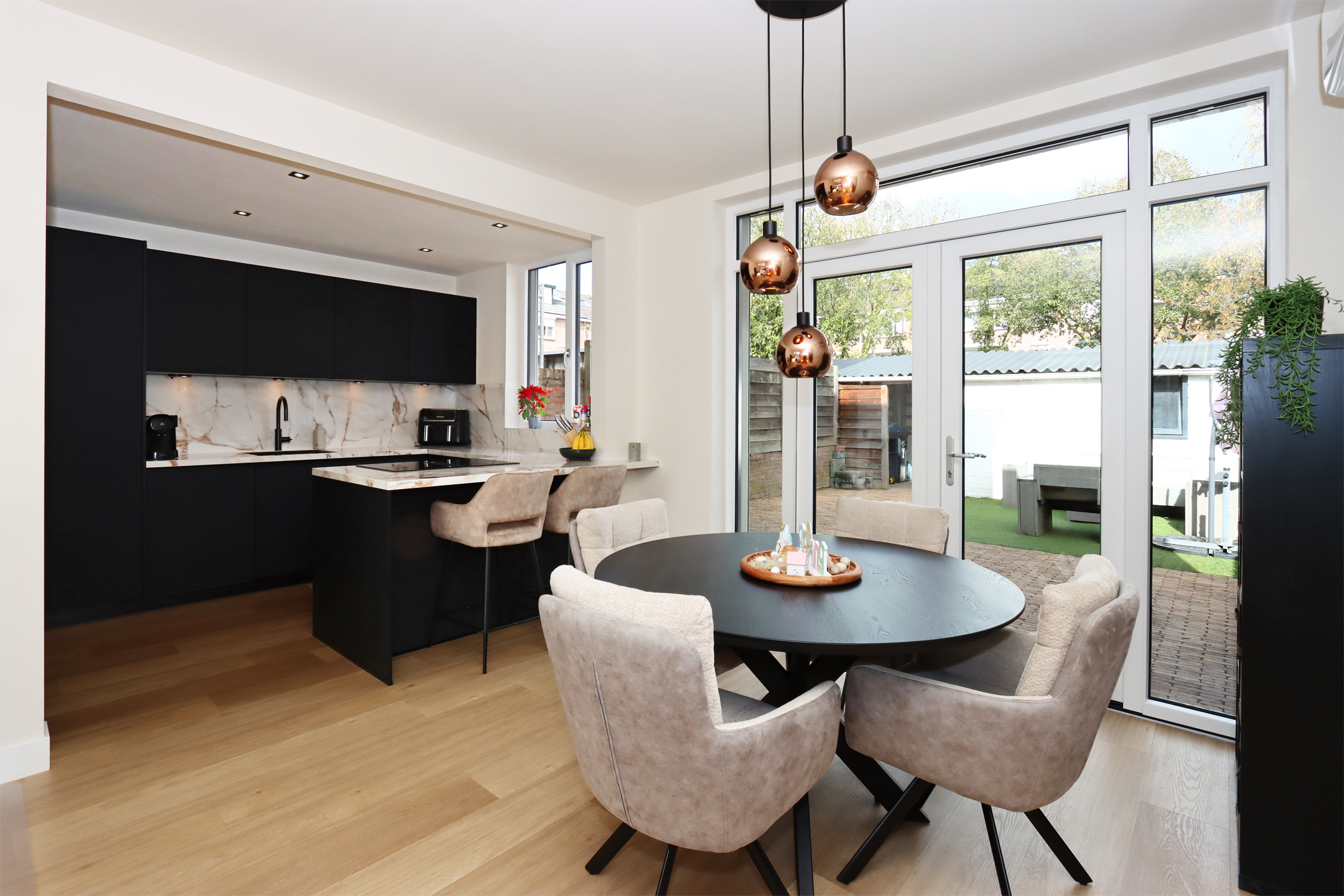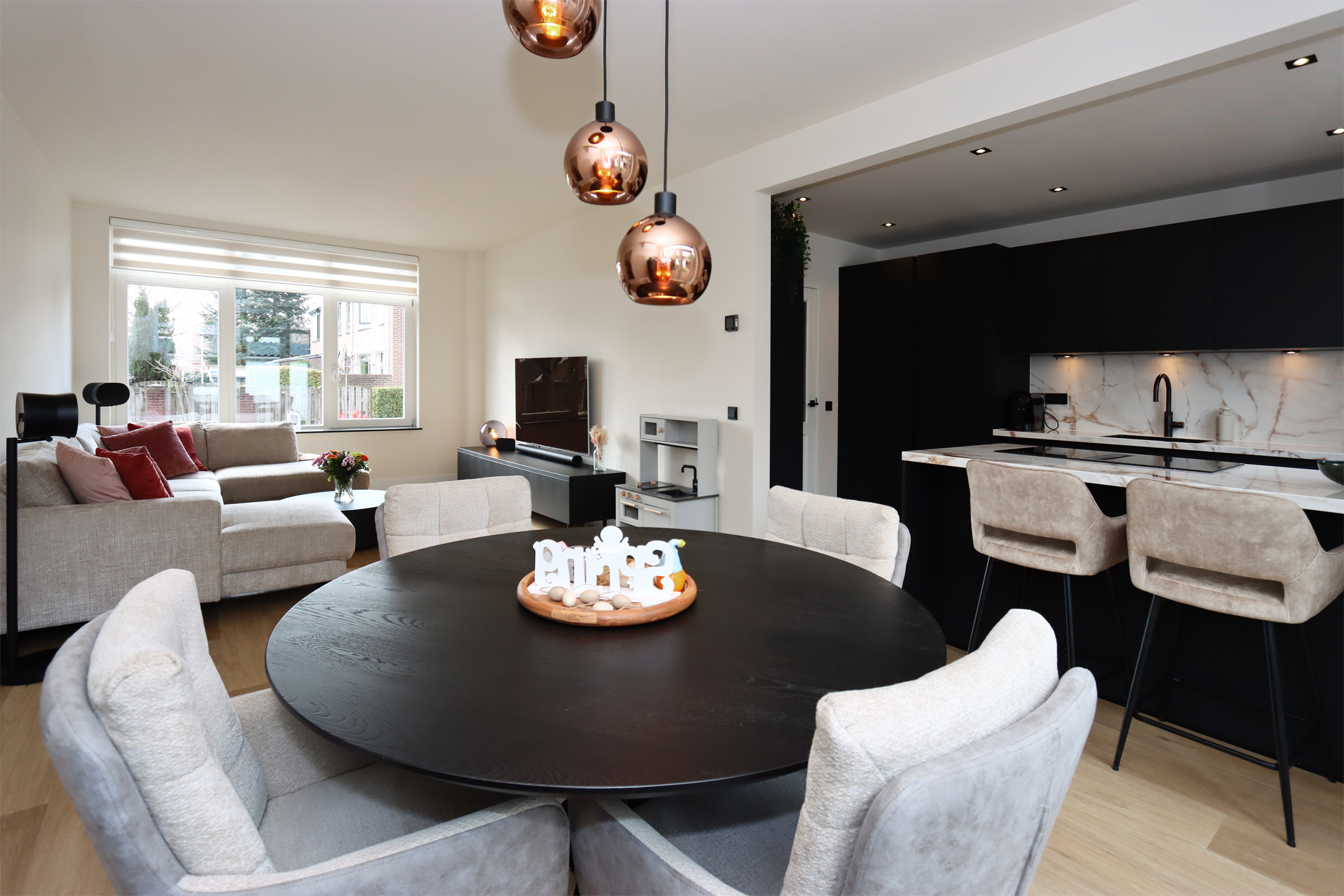 Begane grond: Overdekte entree, hal, toiletruimte met wandcloset en fonteintje, trapopgang, bergkast en garderobe. Open keuken met moderne, zeer complete U-vormige keukeninrichting met diverse inbouwapparatuur, natuurstenen aanrechtblad, bar en separate kastenwand. Doorzon woonkamer met grote raampartij aan voorzijde en raampartij met openslaande deuren naar terras en tuin in eetgedeelte.