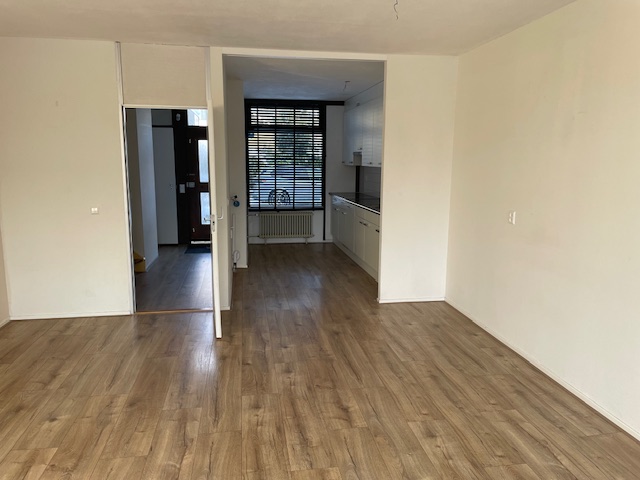 Entree, ruime hal met toilet en fontein en trapopgang. Aan de voorzijde bevindt zich de halfopen keuken met rechte wandopstelling en diverse inbouwapparatuur. De tuingerichte woonkamer beschikt over een grote raampartij en een deur naar het terras en de zonnige achtertuin, wat zorgt voor veel licht en een fijne verbinding met buiten.