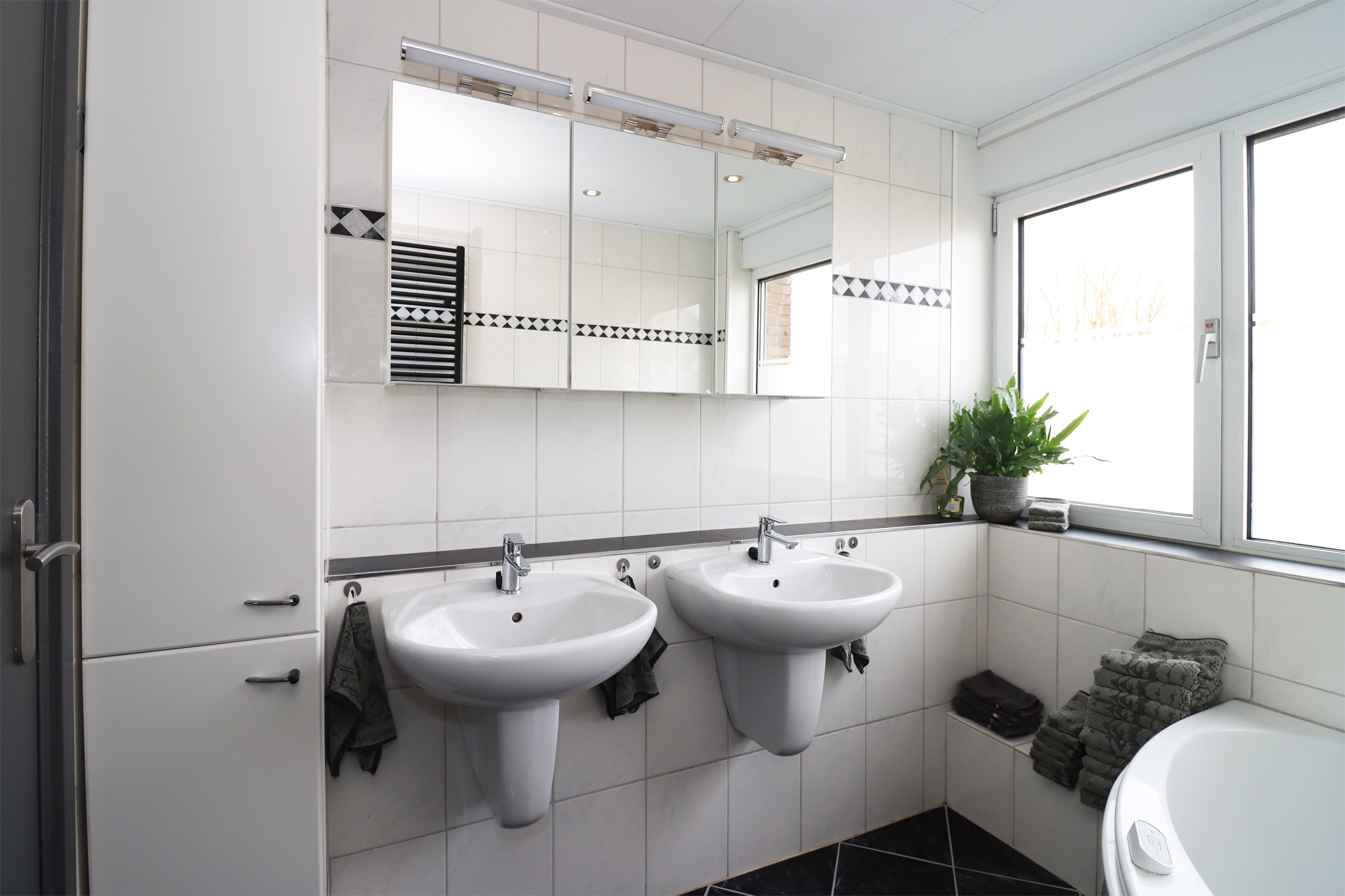 Eerste verdieping: Overloop met inbouwkasten en separate toiletruimte met wandcloset. Drie slaapkamers, waarvan één momenteel is ingericht als inloopkast. Ruime badkamer met bad, douchecabine en twee wastafels.