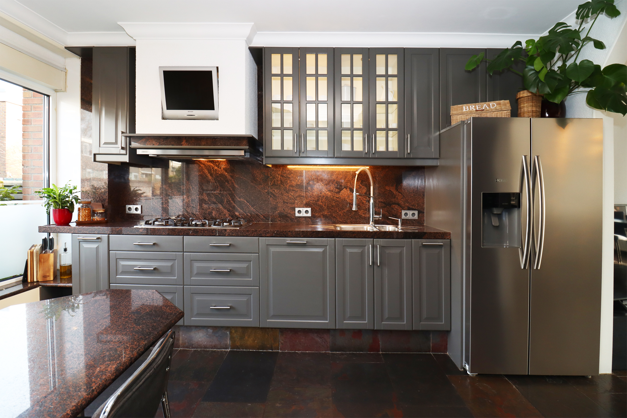 Begane grond: Trapje naar entree, hal met garderobe, trapopgang en toiletruimte met wandcloset en fonteintje. Aan de straatzijde gelegen halfopen keuken met grote raampartij en toegangsdeur naar de kelderruimte. De keuken is voorzien van een rechte keukenopstelling met diverse inbouwapparatuur, een separate koffiecorner en een ingebouwde apparatenkast. De uitgebouwde, tuingerichte woonkamer beschikt over een schouw met gashaard, een lichtkoepel en een grote raampartij met deur naar het terras en de tuin.