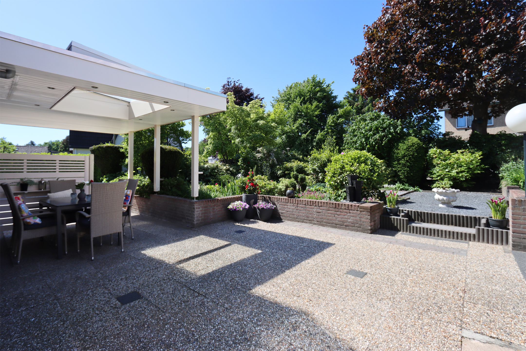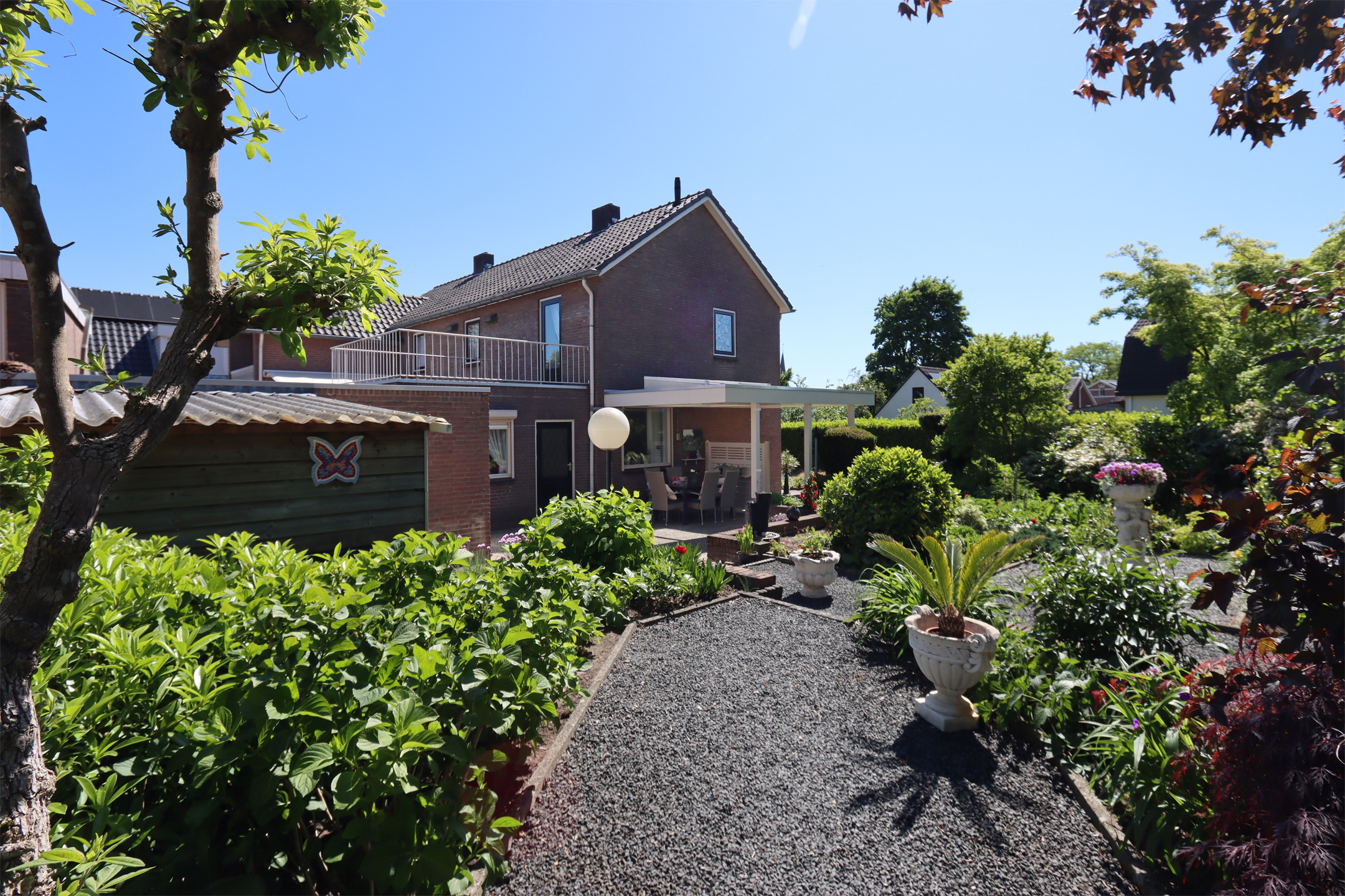 Buiten: Voortuin met siergrind en beplanting. Betegelde oprit naast de woning. De royale, op het westen gesitueerde, zijtuin heeft een enorm betegeld, gedeeltelijk overdekt (voorheen carport), terras. De zonnige zijtuin heeft een trapje hoger siergrind, borders voorzien van vaste planten, bomen, begroeiingen en achterom. In de fraai aangelegde tuin zijn er op elk moment van de dag zowel zon- als schaduwplekjes te vinden. De, op het noordwesten gesitueerde, achtertuin is geheel betegeld en omsloten door tuinmuren en -schermen, waardoor deze veel privacy biedt. Tevens een ruim balkon aan de achterzijde van de woning.