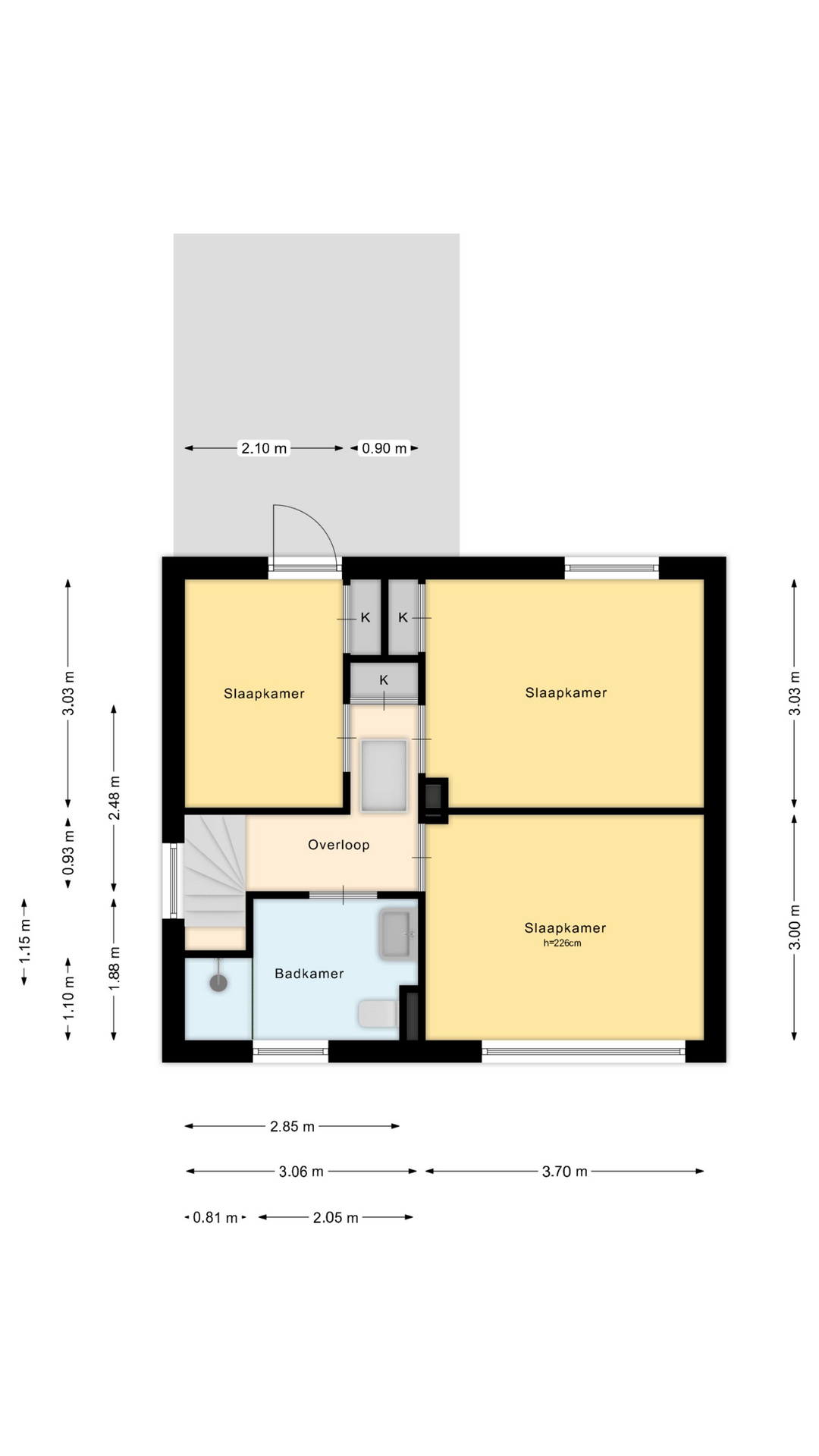 Eerste verdieping: Overloop met inbouwkast. Drie slaapkamers, waarvan één slaapkamer met inbouwkast en één met toegang tot balkon. Ruime badkamer met wastafelmeubel, wandcloset en een ruime douchecabine.