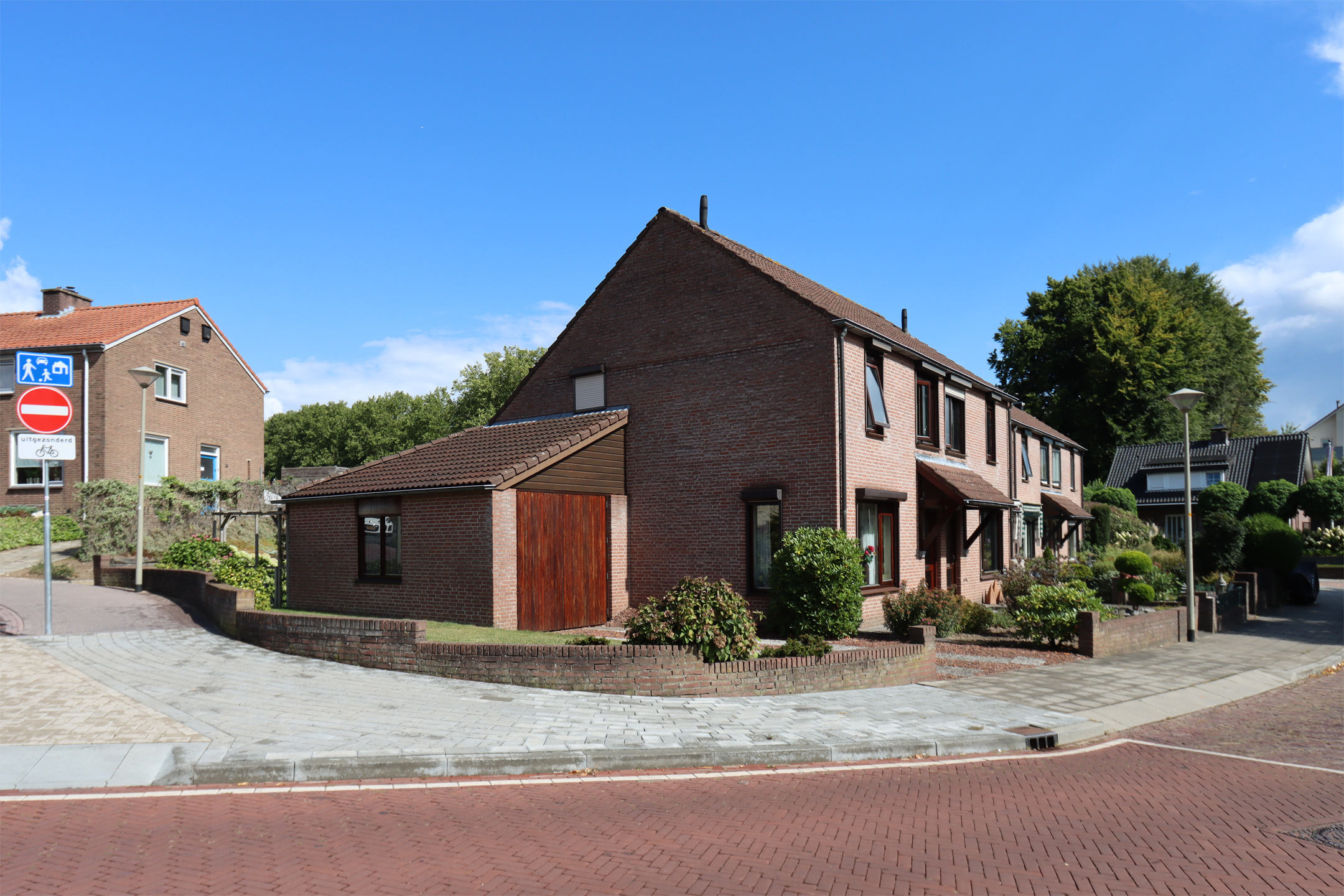 Buiten: Voortuin met siergrind en beplanting. Betegelde oprit en aangebouwde garage met smeerput naast de woning. De, op het zuidwesten gesitueerde, zij-tuin heeft een gazon en beplante border. De, op het noordwesten gesitueerde, achtertuin is grotendeels bestraat met beplante borders en heeft een achterom.