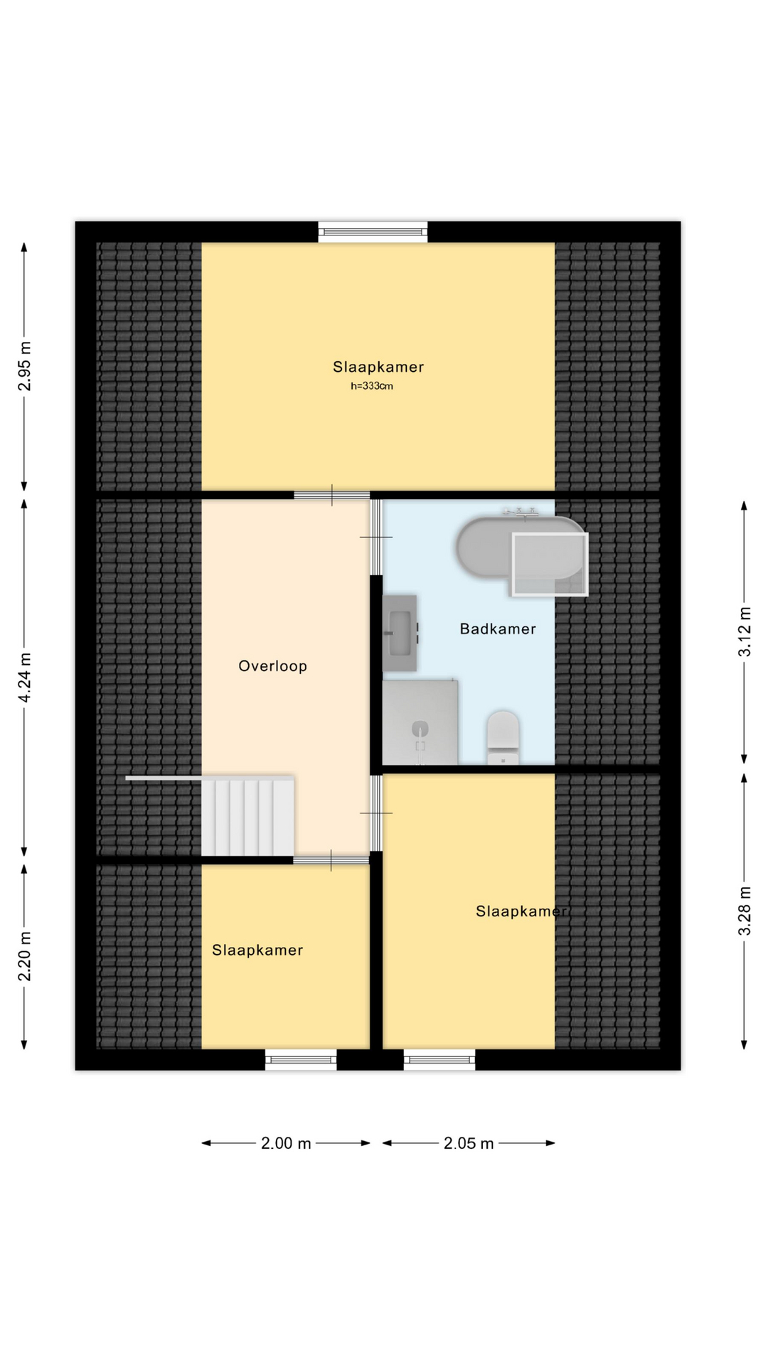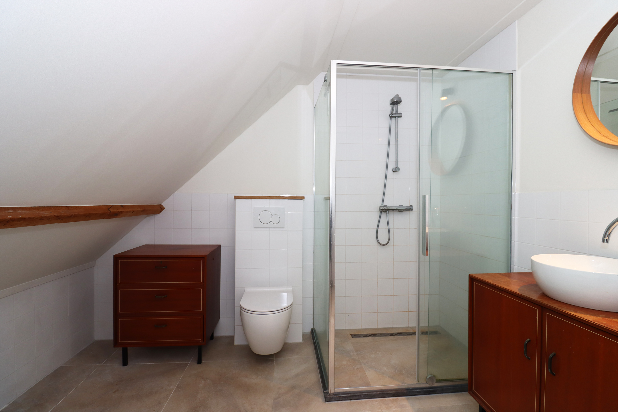 Royale overloop met toegang tot drie comfortabele slaapkamers, waaronder de master bedroom. De moderne badkamer is stijlvol uitgevoerd met een vrijstaand bad, wastafelmeubel met waskom, douchecabine en wandcloset.