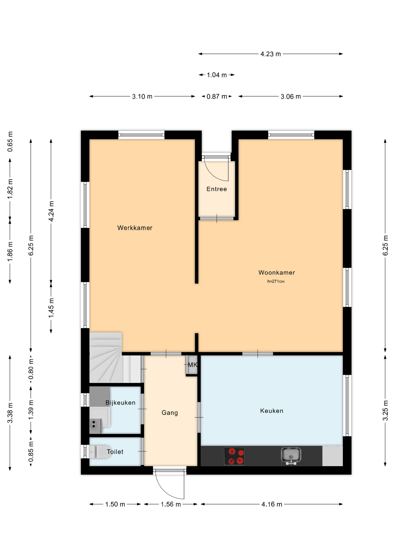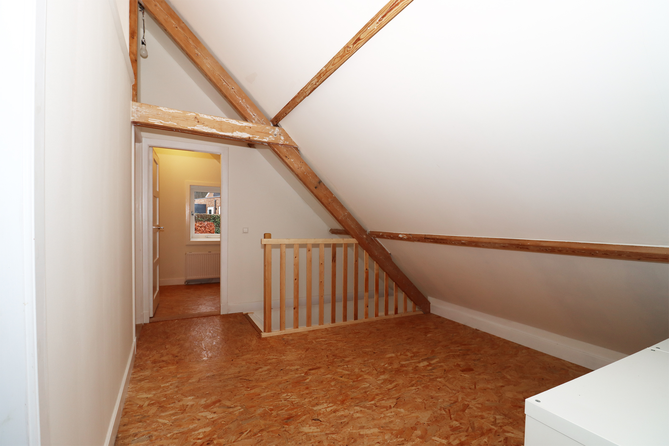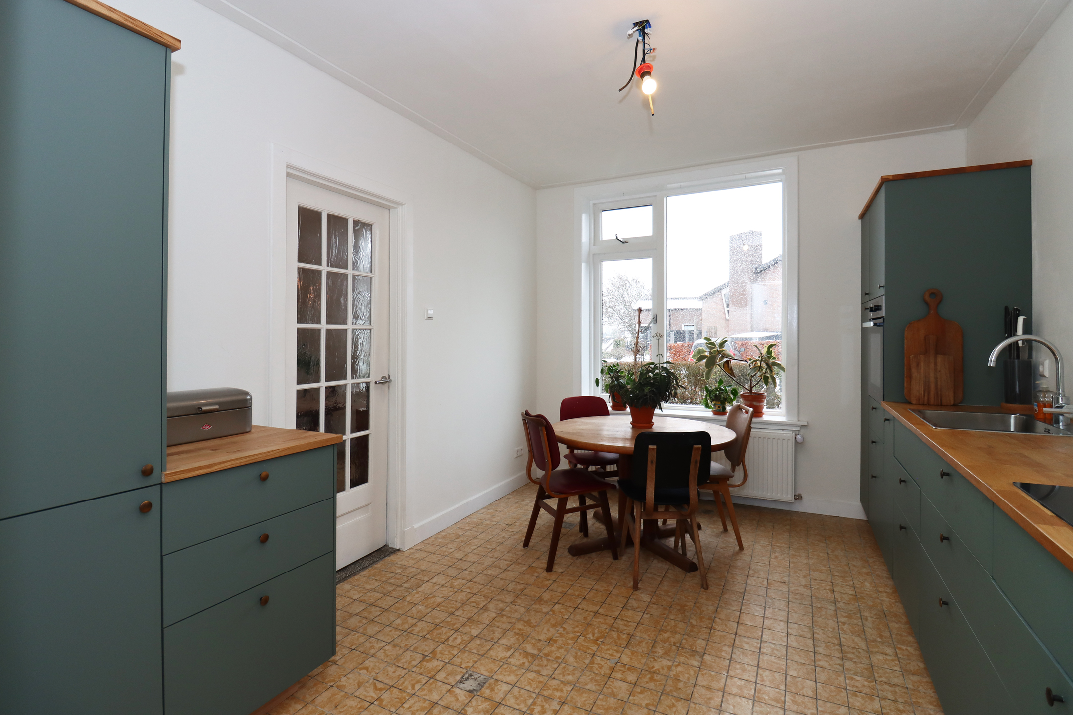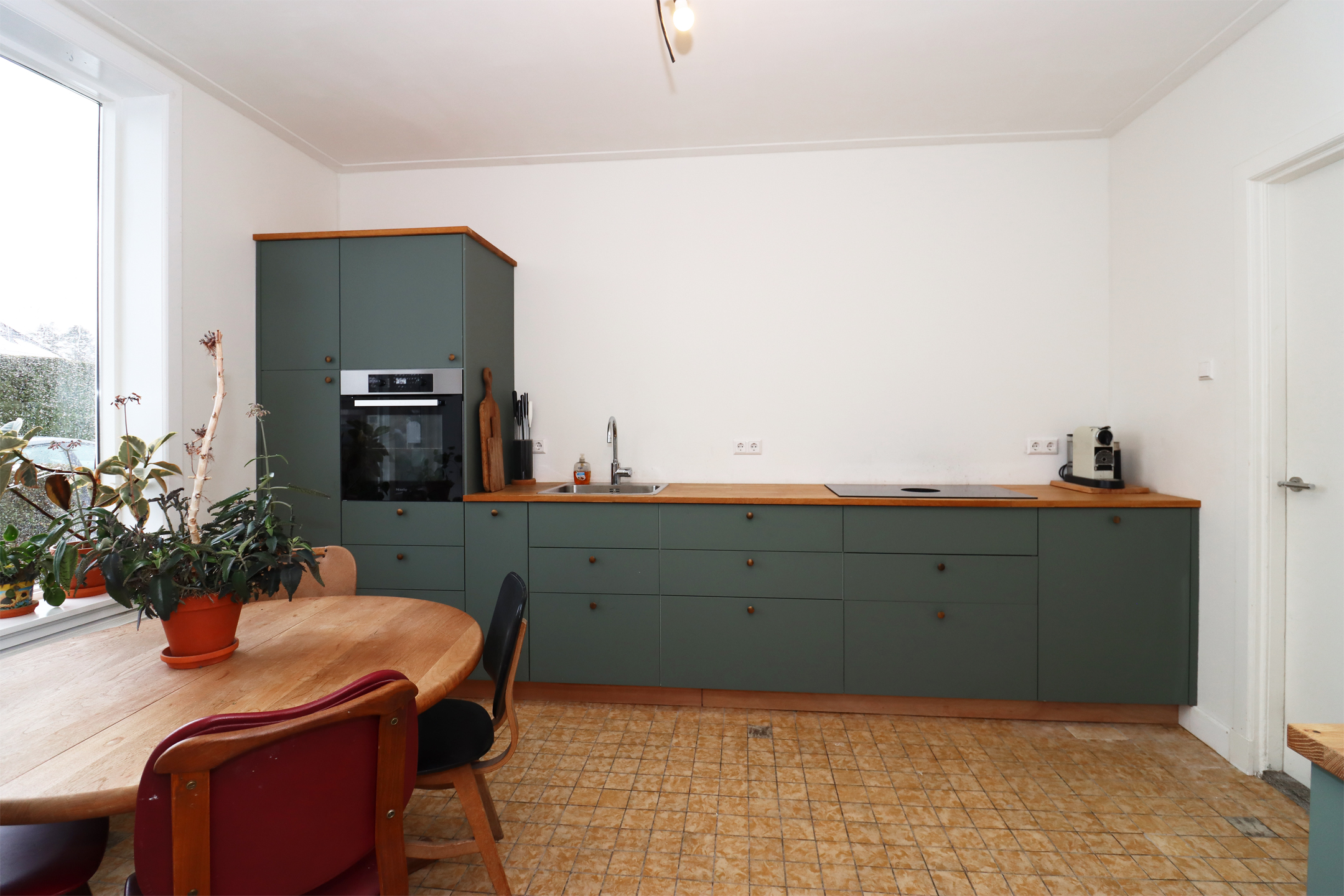 De ruime, gesloten leefkeuken is voorzien van een rechte keukenopstelling met diverse inbouwapparatuur en een praktische vaste kast. Vanuit de hal, met deur naar oprit en tuin, is er toegang tot de ruime provisiekelder, de toiletruimte met wandcloset en een berging met cv-installatie en witgoedaansluitingen.