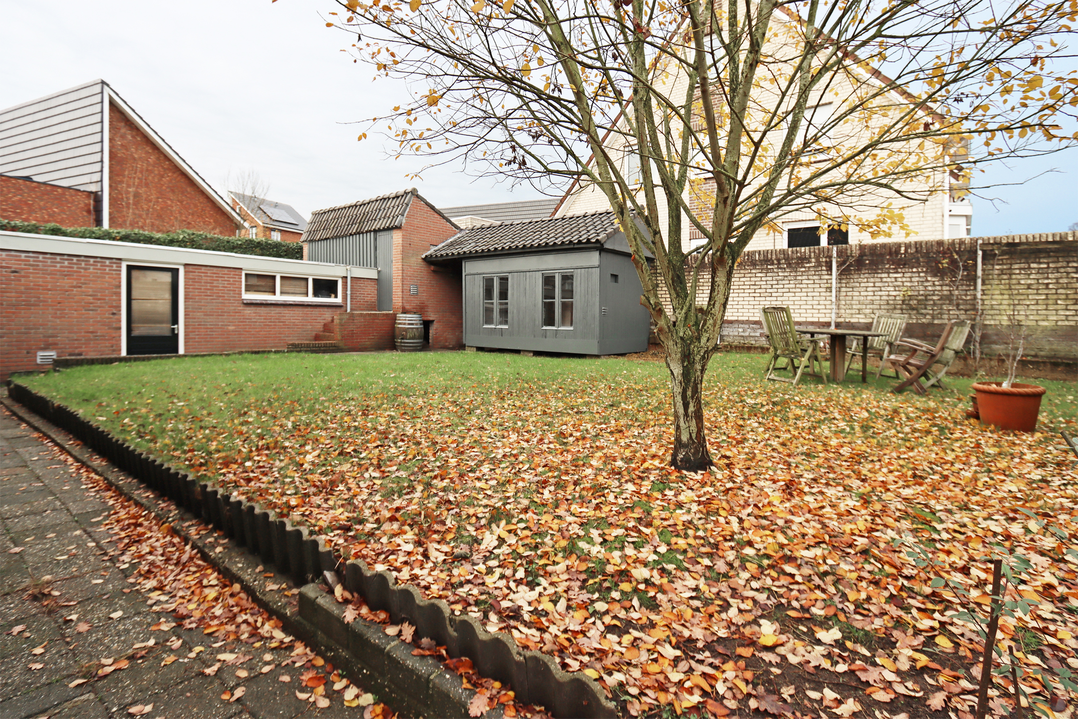 De woning beschikt over een verzorgde voortuin, een bestraatte oprit en een royale vrijstaande stenen garage. De op het zuidwesten gelegen achtertuin is volledig omsloten door tuinmuren en een groenblijvende haag, wat zorgt voor optimale privacy. De tuin is ruim opgezet en voorzien van een groot gazon, een stenen en een houten berging en een praktische achterom.