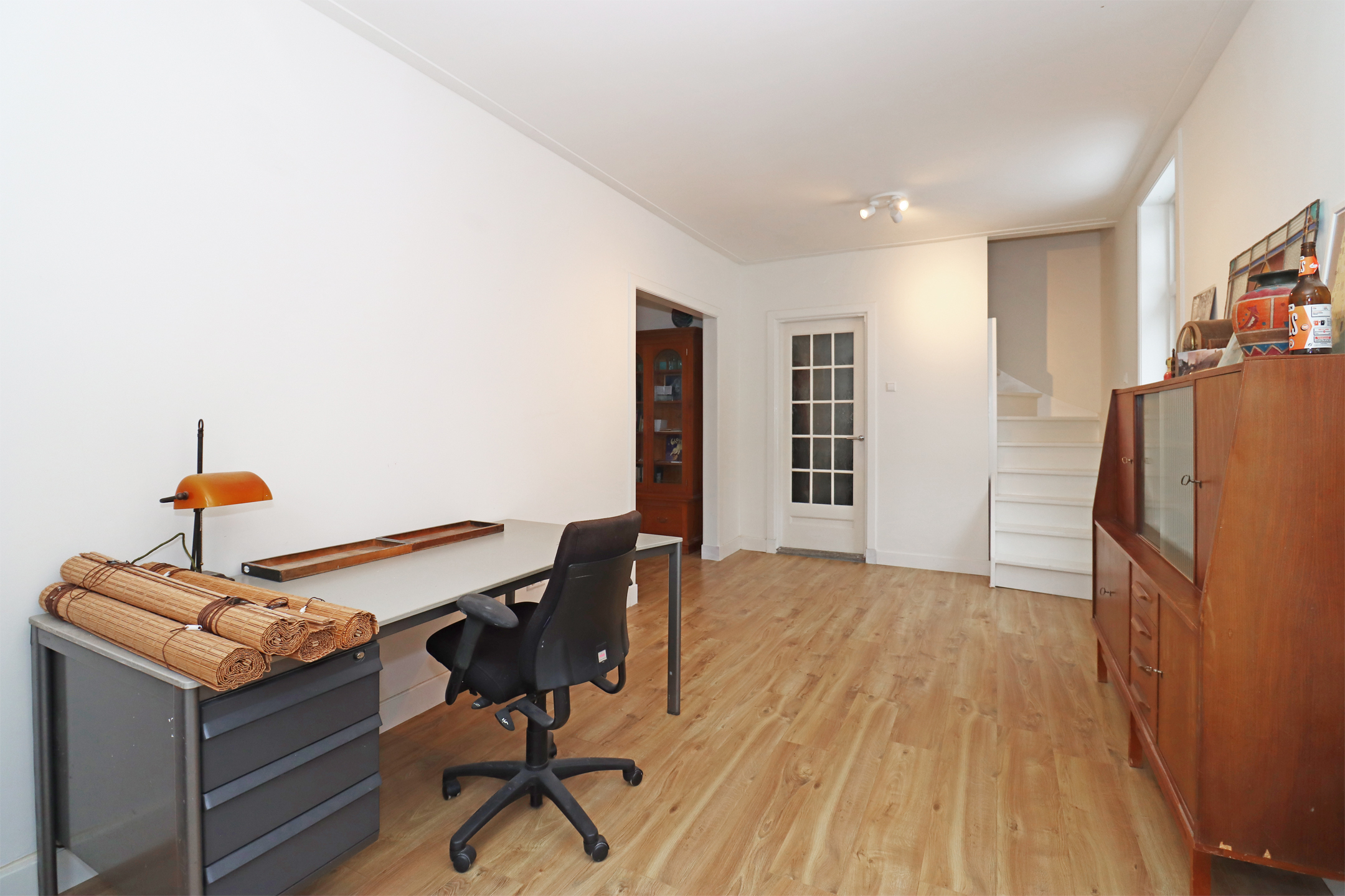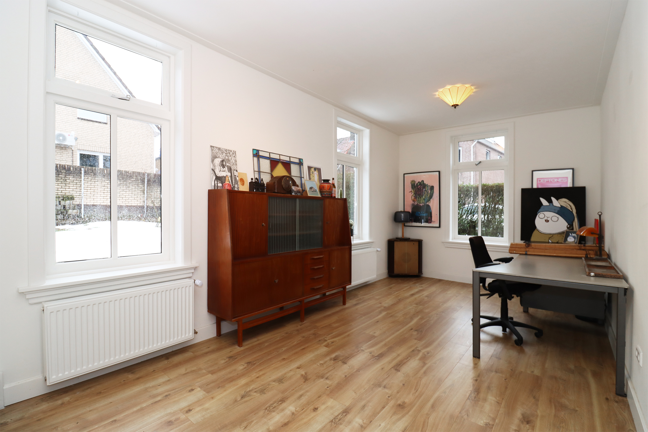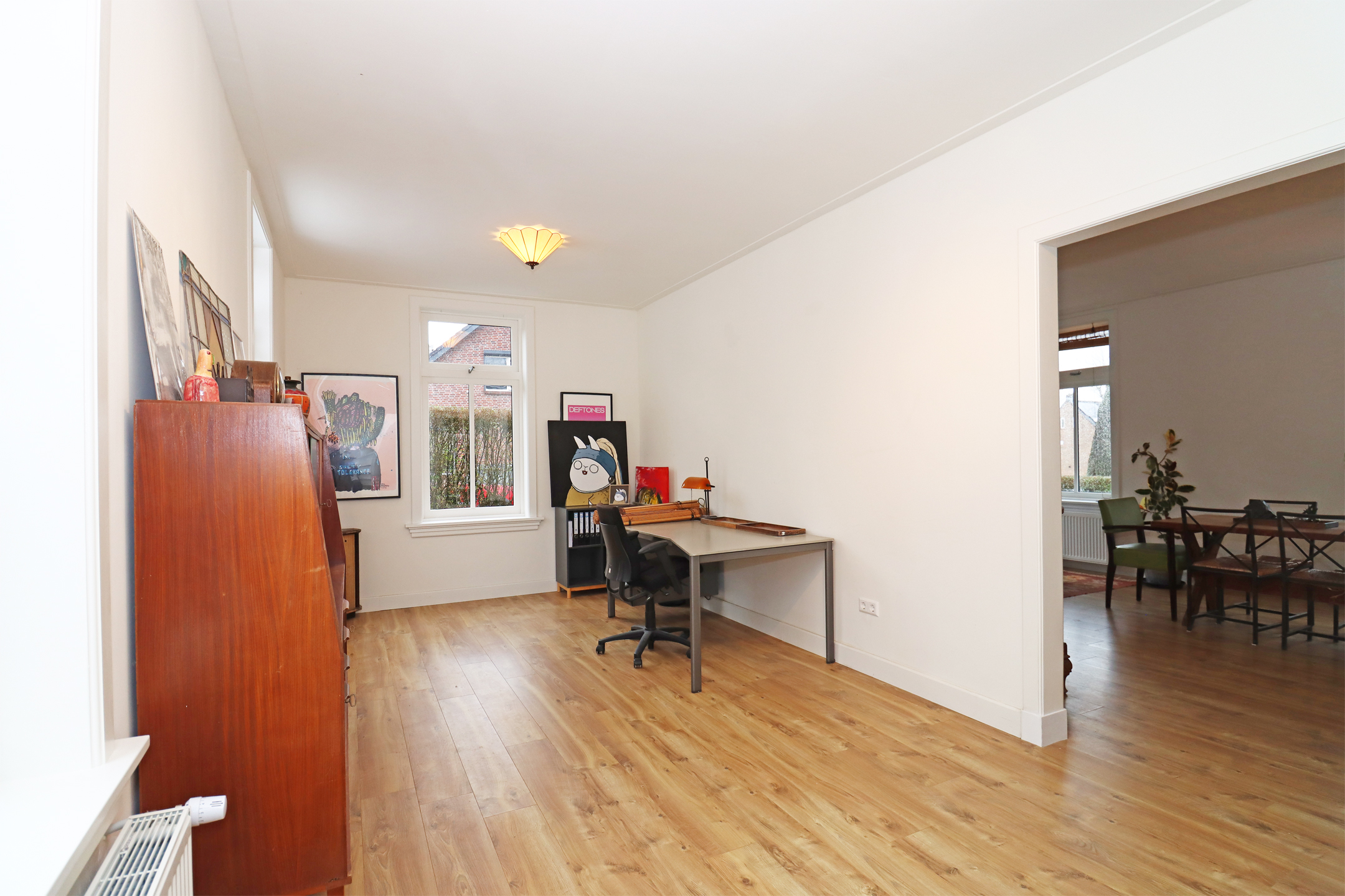 Overdekte entree en portaal. De royale woonkamer is opvallend licht dankzij de vele raampartijen en bestaat uit een gezellige lounge-/zithoek aan de straatzijde en een eetgedeelte. Via een halfopen verbinding bereikt u het tuingerichte deel van de woonkamer met trapopgang, momenteel ingericht als werkplek.