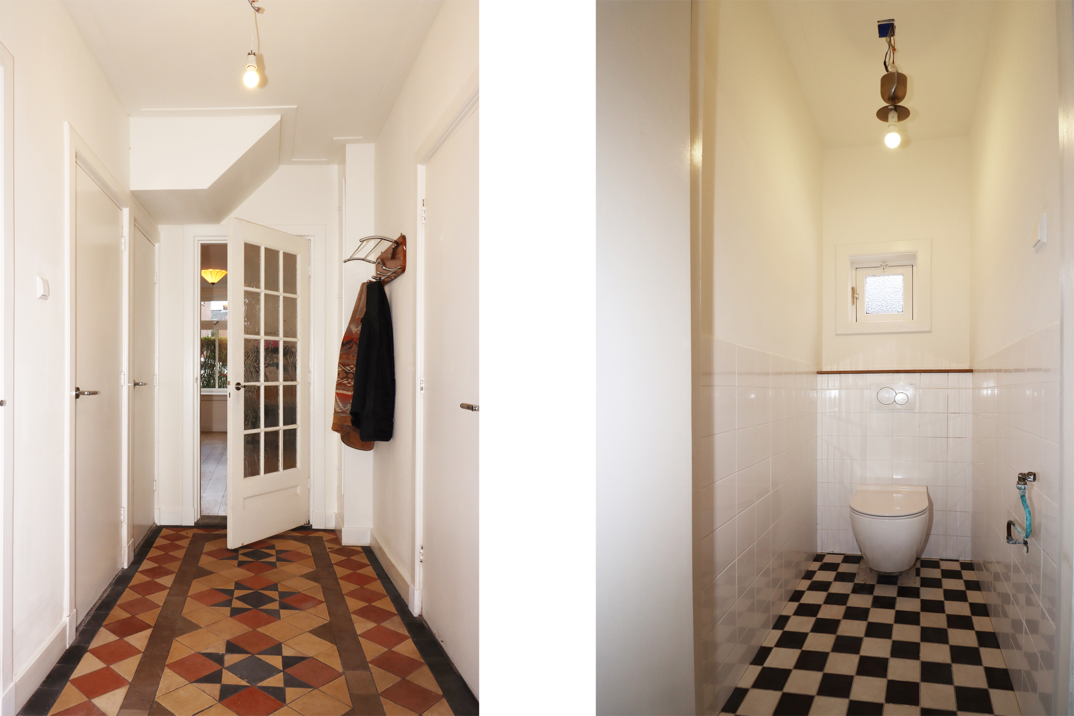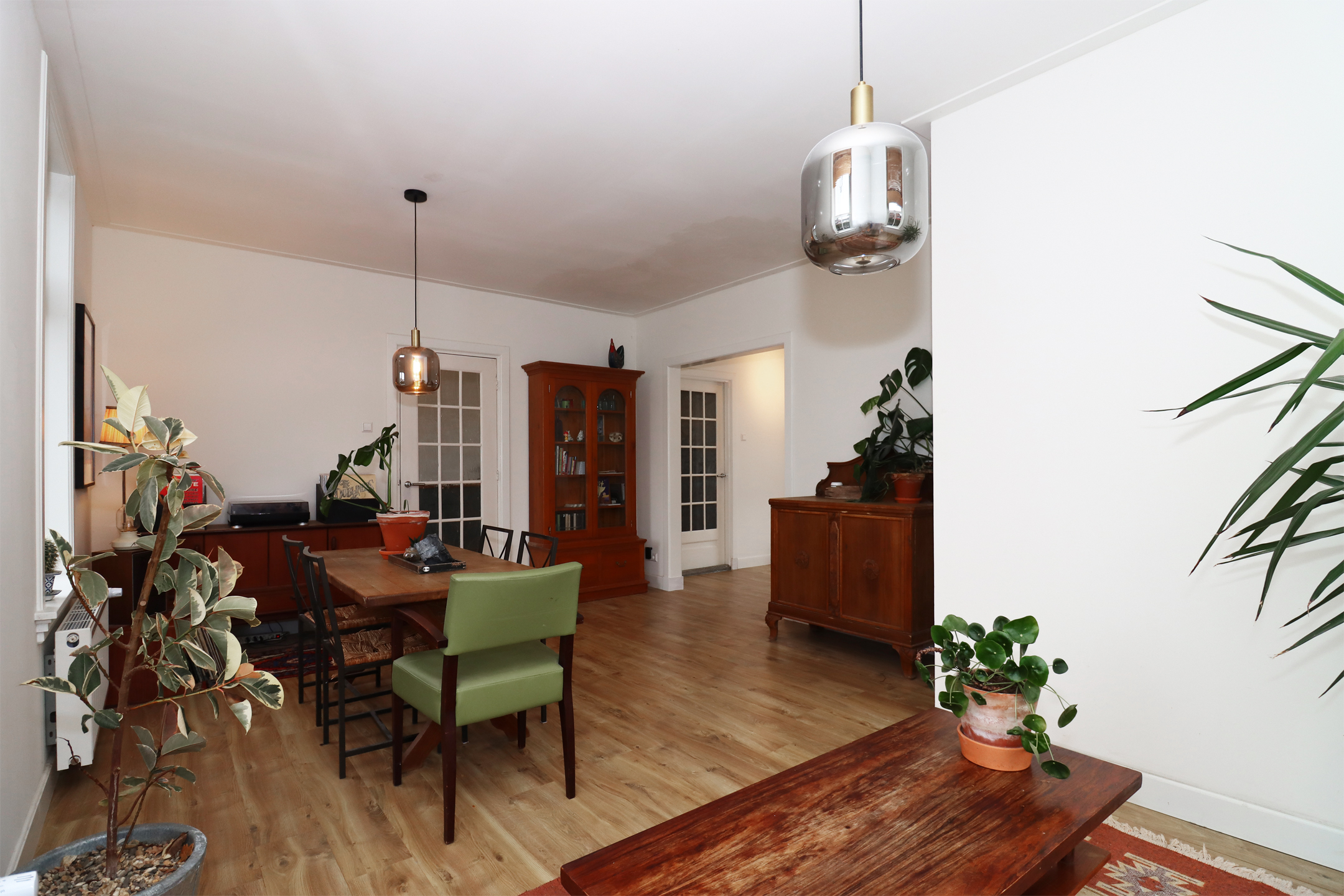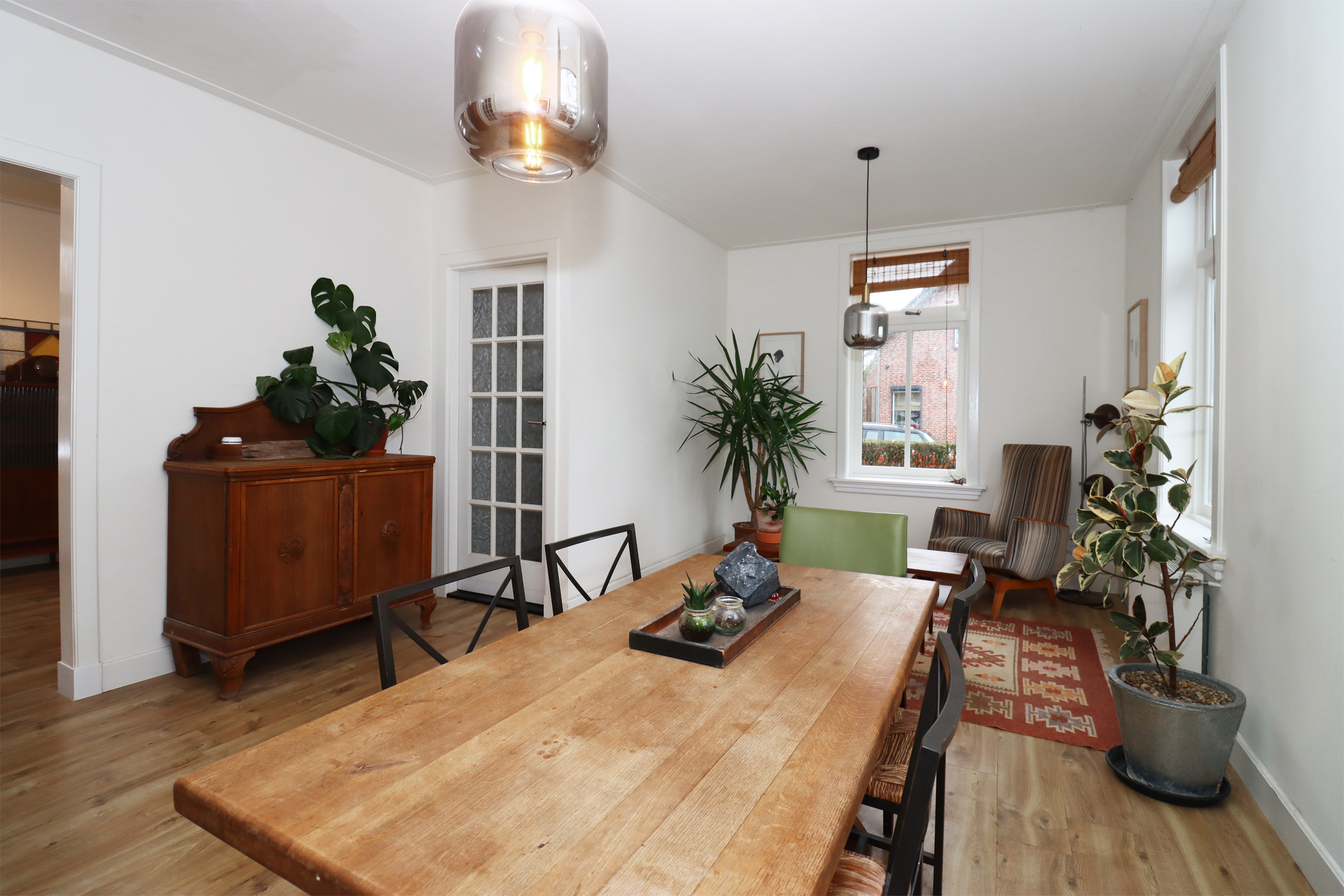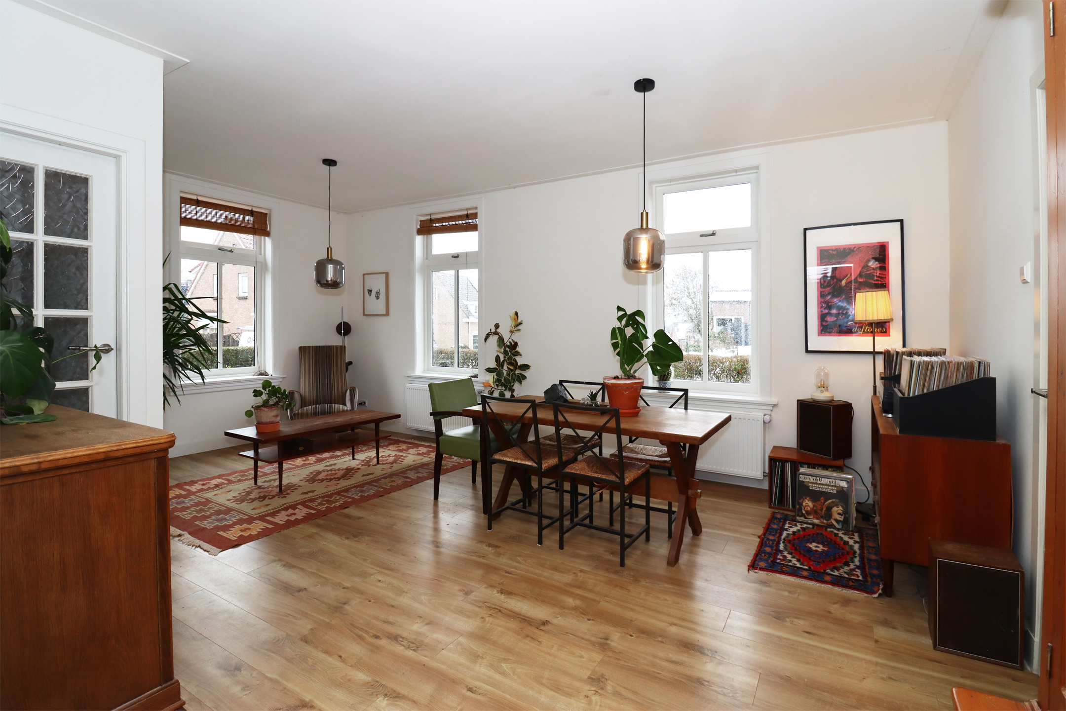 Overdekte entree en portaal. De royale woonkamer is opvallend licht dankzij de vele raampartijen en bestaat uit een gezellige lounge-/zithoek aan de straatzijde en een eetgedeelte. Via een halfopen verbinding bereikt u het tuingerichte deel van de woonkamer met trapopgang, momenteel ingericht als werkplek.