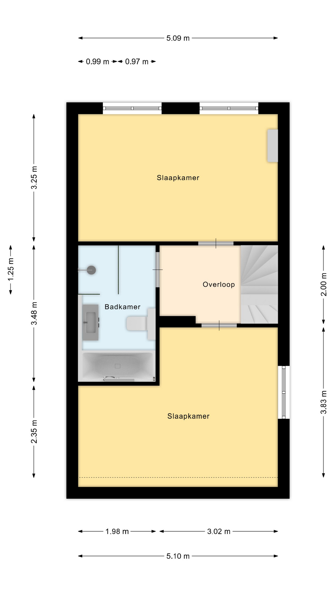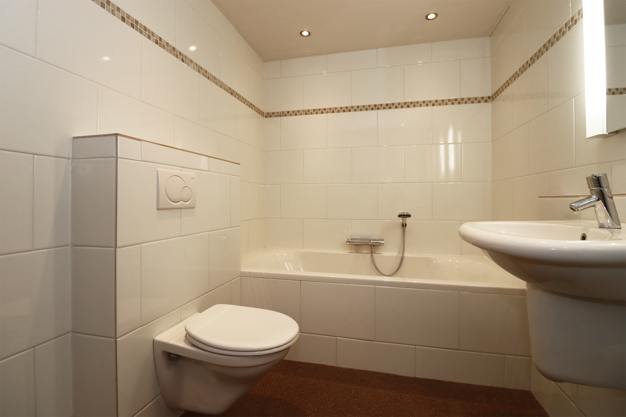 Eerste verdieping: Overloop. Twee slaapkamers, waaronder een ruime slaapkamer en de royale masterbedroom (voorheen twee slaapkamers). Indien u liever drie slaapkamers op deze verdieping wenst, is dit eenvoudig te realiseren. Ruime badkamer met inloopdouche, wastafel, ligbad en wandcloset.