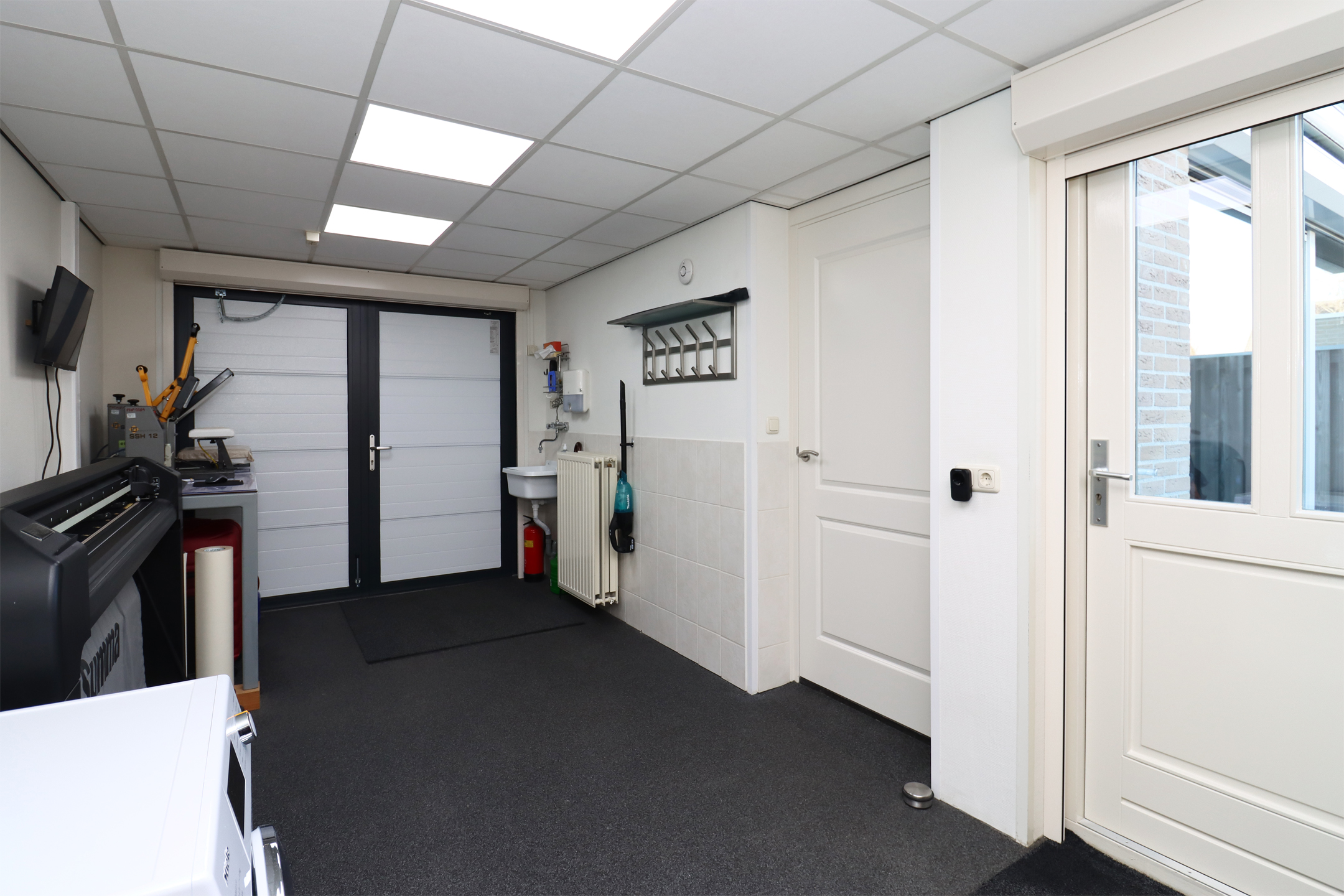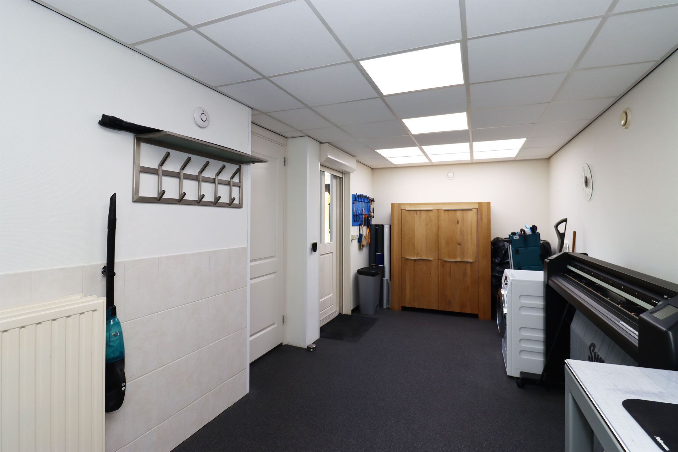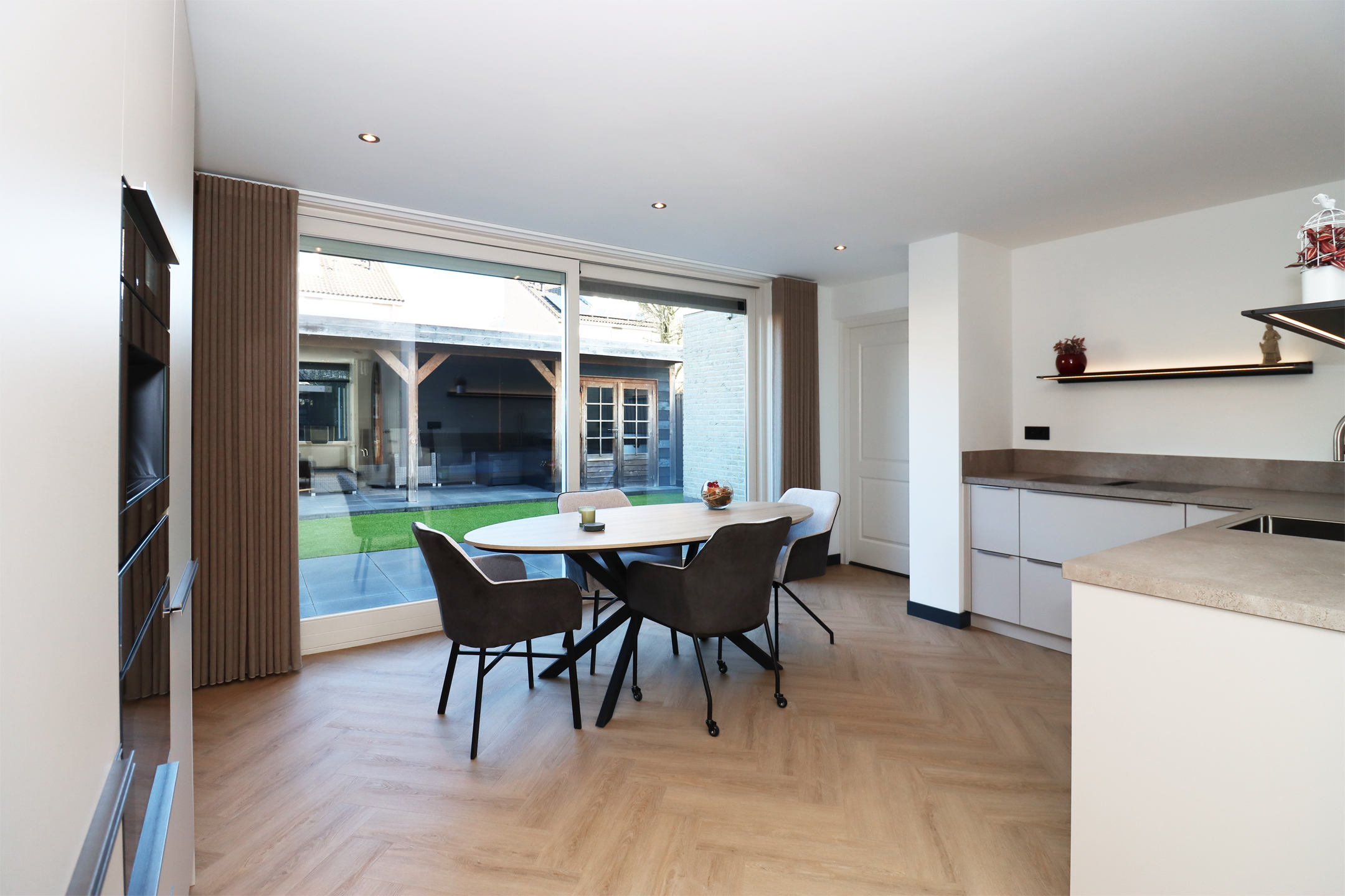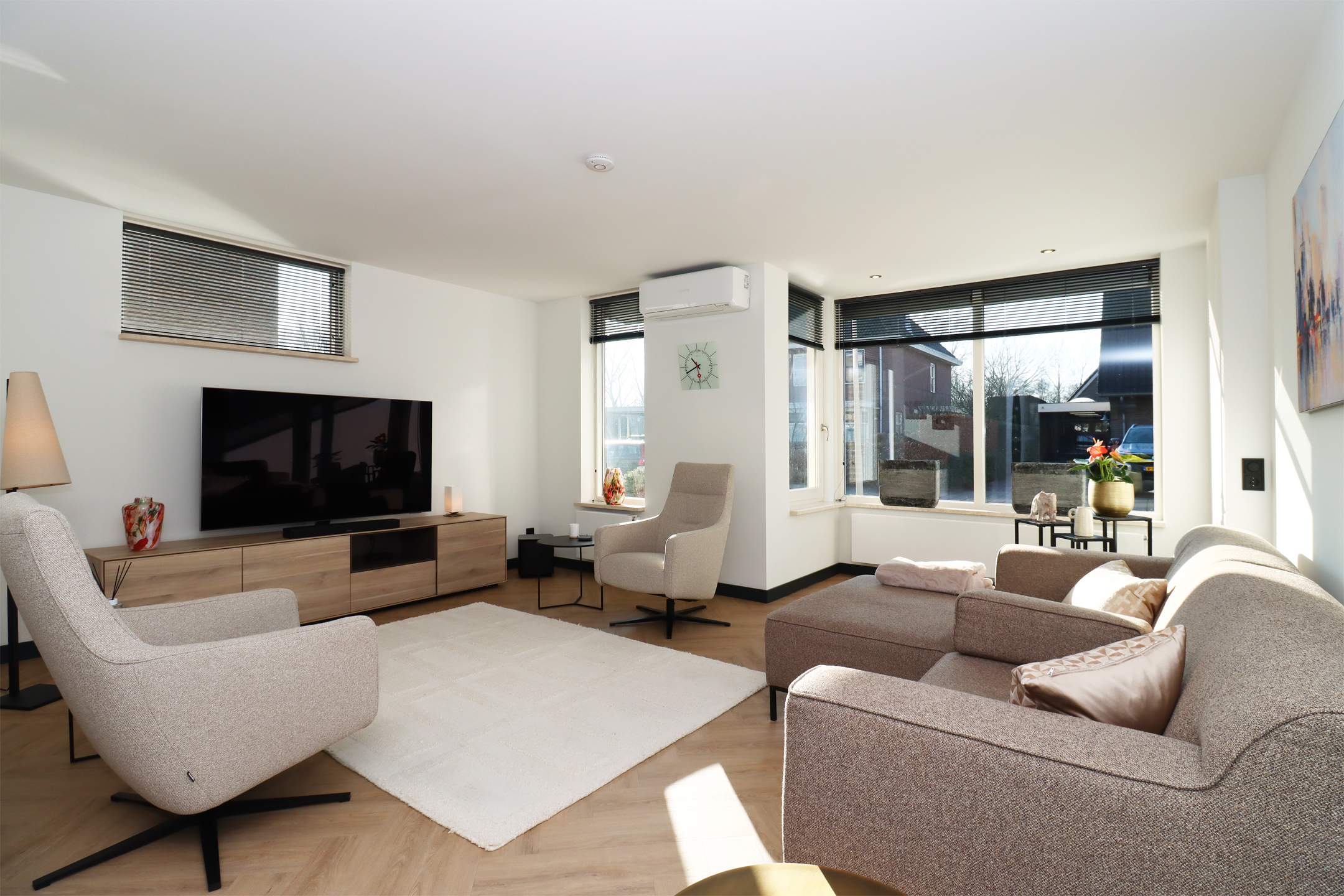 Begane grond: Overdekte zij-entree, ruime hal met trapopgang, garderobe en toiletruimte met wandcloset en fonteintje. Ruime L-vormige woonkamer met aangebouwde erker in de lounge-/zithoek. Royale halfopen keuken met moderne, hoekopgestelde keukeninrichting, hoge apparatenkast en diverse Miele inbouwapparatuur. De uitgebouwde leefkeuken beschikt over een ruim eetgedeelte, een brede schuifpui naar het terras en de tuin en een directe doorgang naar de berging/werkruimte. De gehele begane grond (m.u.v. de berging/werkruimte) is in 2024 volledig gemoderniseerd en afgewerkt met een doorlopende, lichte pvc-vloer. Aangebouwde berging/werkruimte met uitstortgootsteen, witgoedaansluiting, openslaande deuren naar de oprit en zowel een deur naar de keuken als naar het terras en de tuin.
