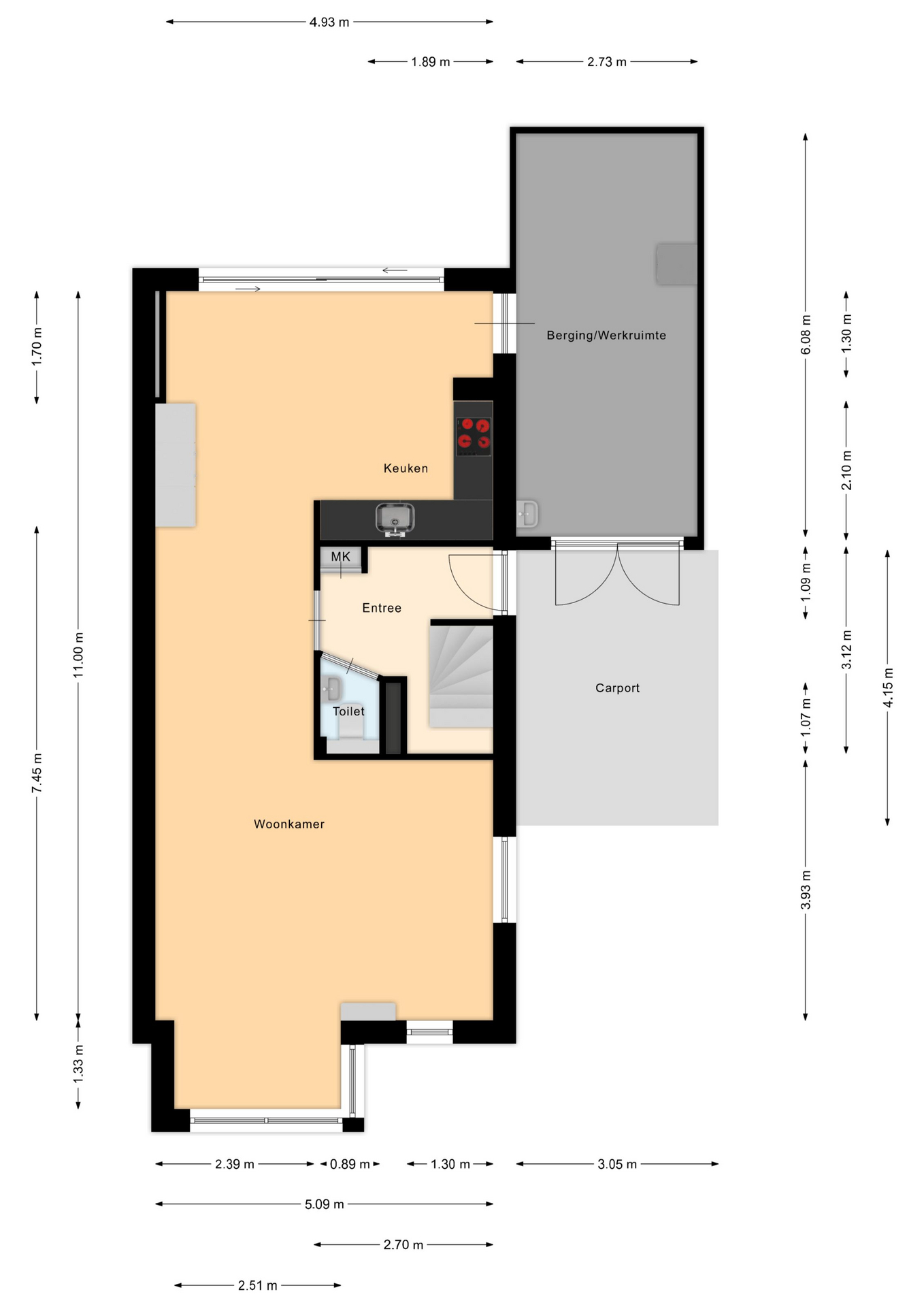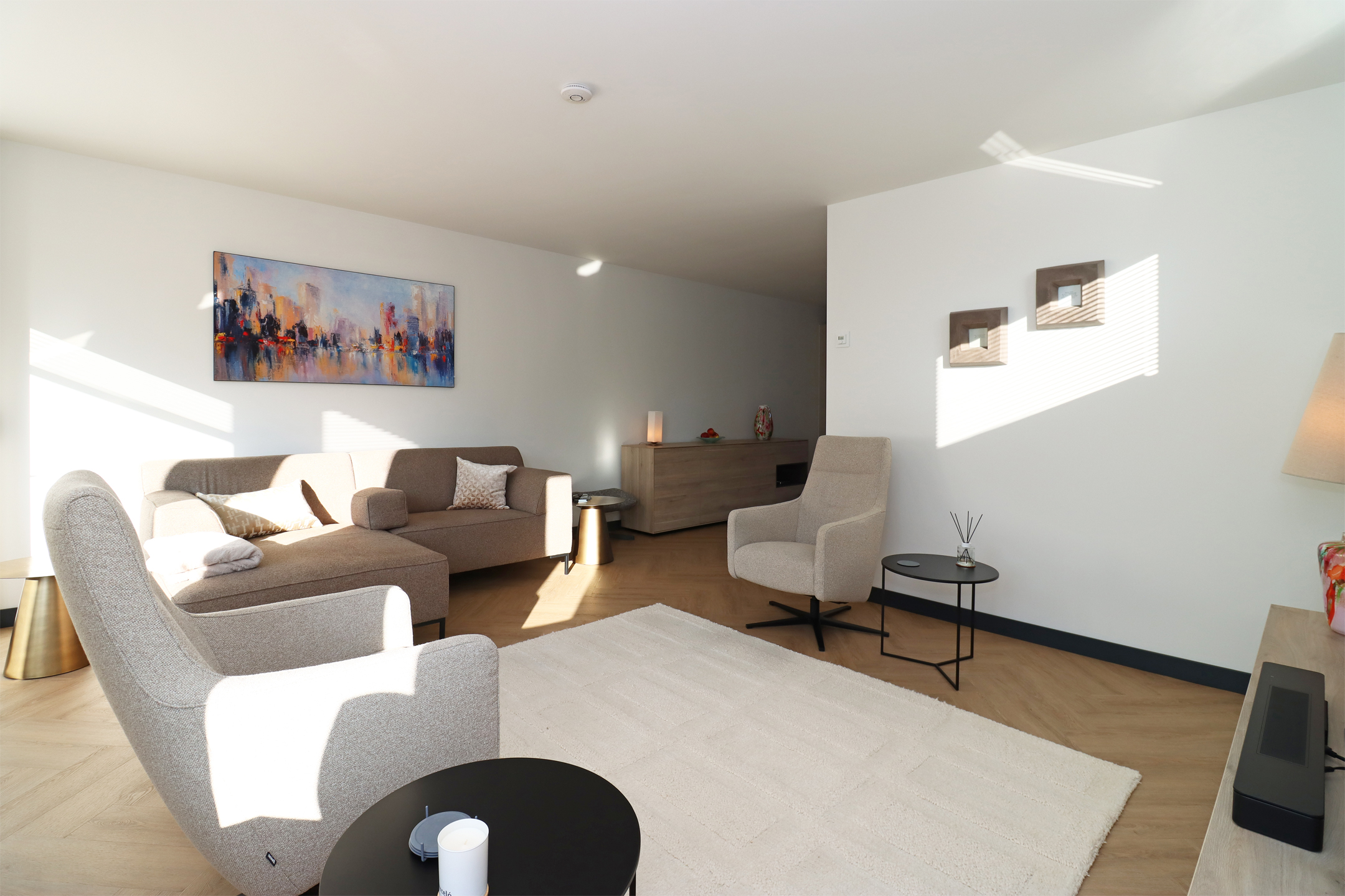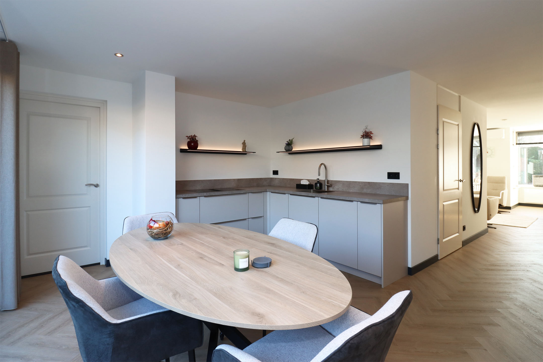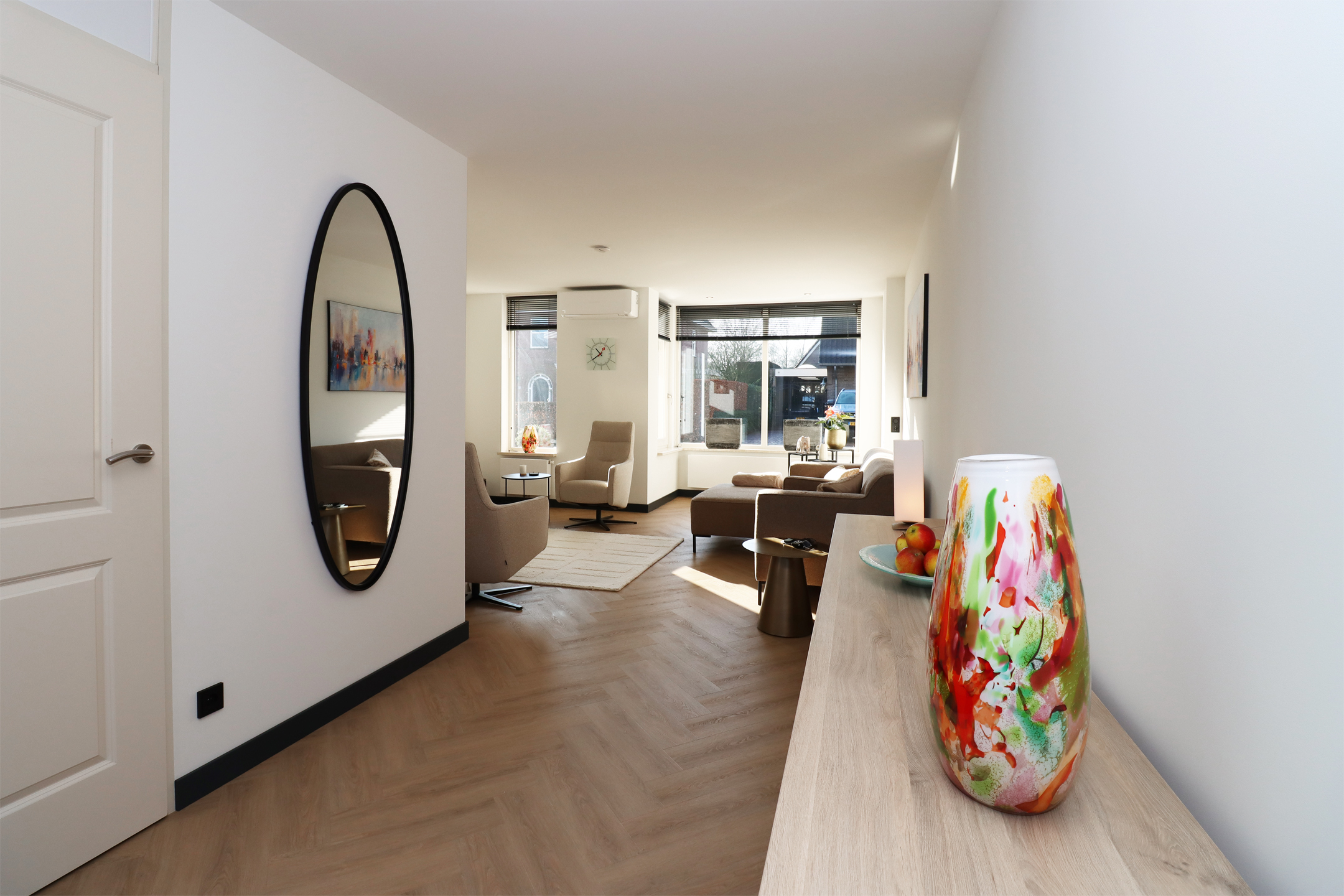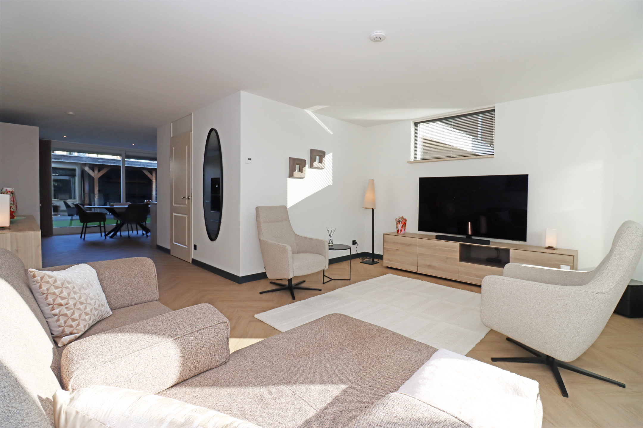 Begane grond: Overdekte zij-entree, ruime hal met trapopgang, garderobe en toiletruimte met wandcloset en fonteintje. Ruime L-vormige woonkamer met aangebouwde erker in de lounge-/zithoek. Royale halfopen keuken met moderne, hoekopgestelde keukeninrichting, hoge apparatenkast en diverse Miele inbouwapparatuur. De uitgebouwde leefkeuken beschikt over een ruim eetgedeelte, een brede schuifpui naar het terras en de tuin en een directe doorgang naar de berging/werkruimte. De gehele begane grond (m.u.v. de berging/werkruimte) is in 2024 volledig gemoderniseerd en afgewerkt met een doorlopende, lichte pvc-vloer. Aangebouwde berging/werkruimte met uitstortgootsteen, witgoedaansluiting, openslaande deuren naar de oprit en zowel een deur naar de keuken als naar het terras en de tuin.