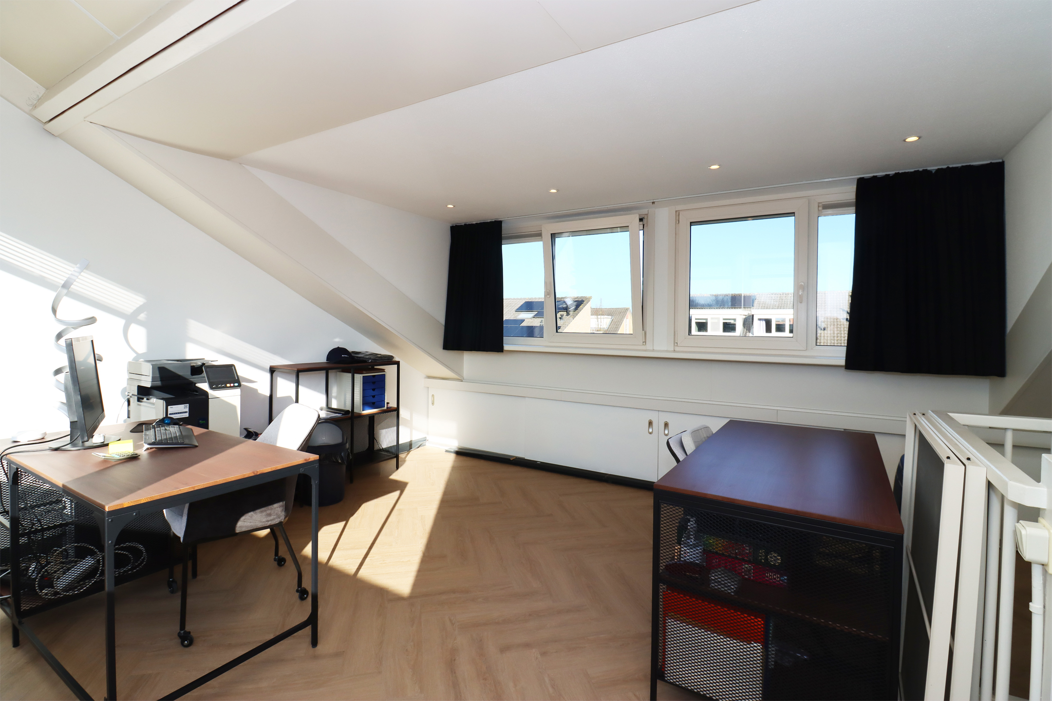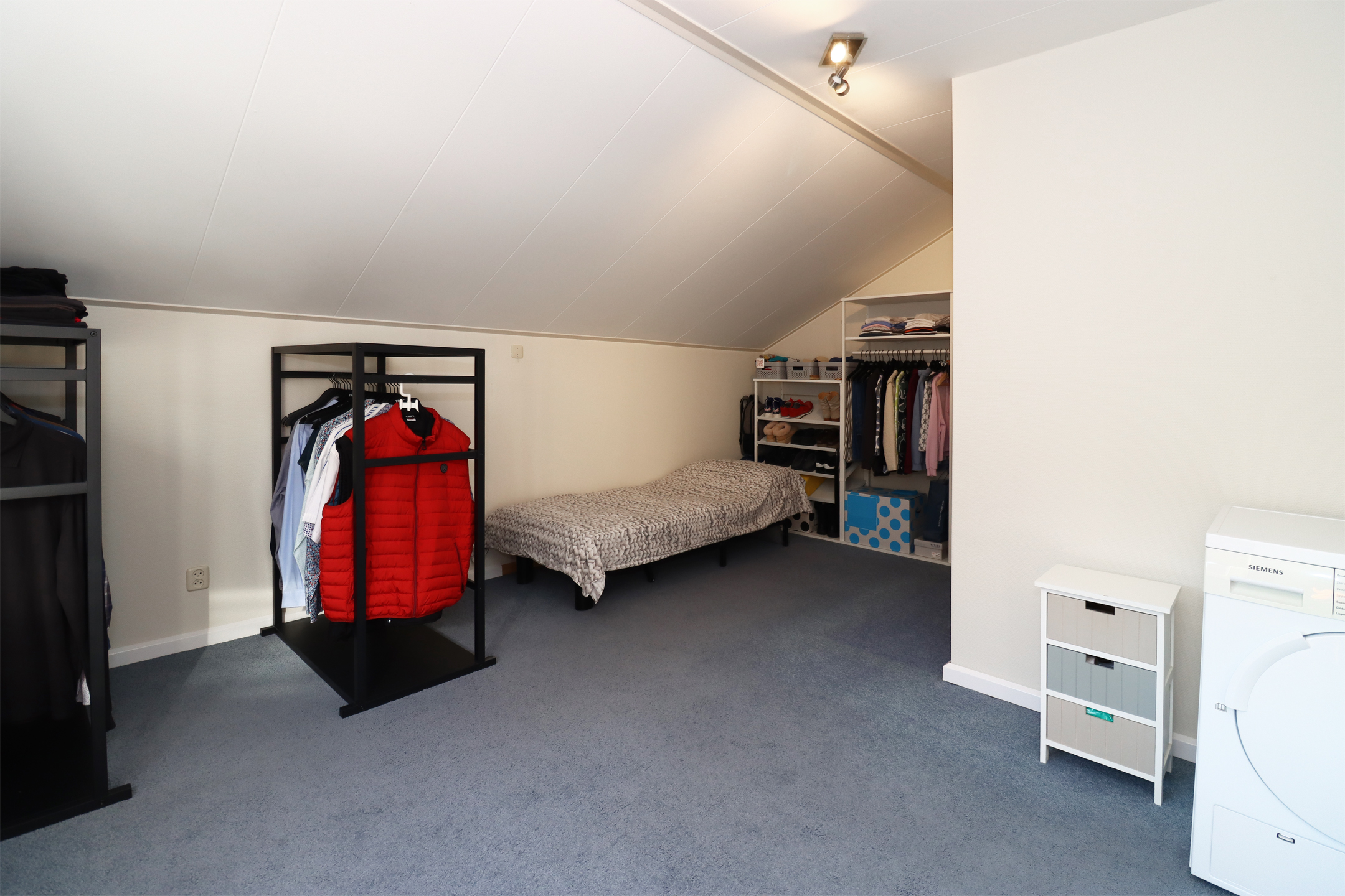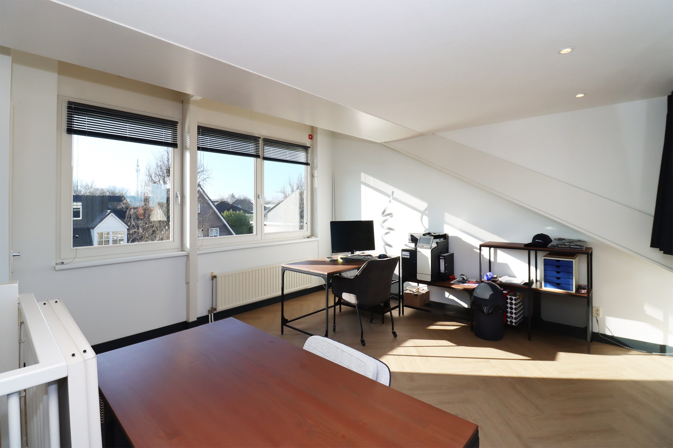 Tweede verdieping: Via een vaste trap bereikbare volwaardige verdieping met praktische inbouwkast, waarin de cv-installatie en de omvormer van het zonne-energiesysteem zijn geplaatst. Dankzij de raampartijen in de voorgevel en de grote dakkapel aan de achterzijde geniet deze verdieping van een prachtige lichtinval. De ruimte is in 2024 gemoderniseerd, afgewerkt met een lichte pvc-vloer en momenteel ingericht als kantoor, maar leent zich uitstekend als extra slaap- of logeerkamer.