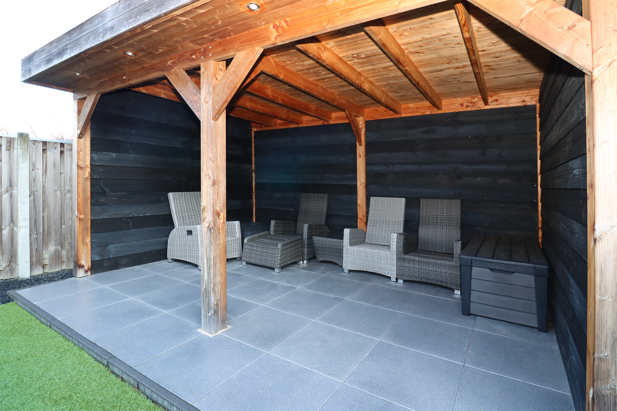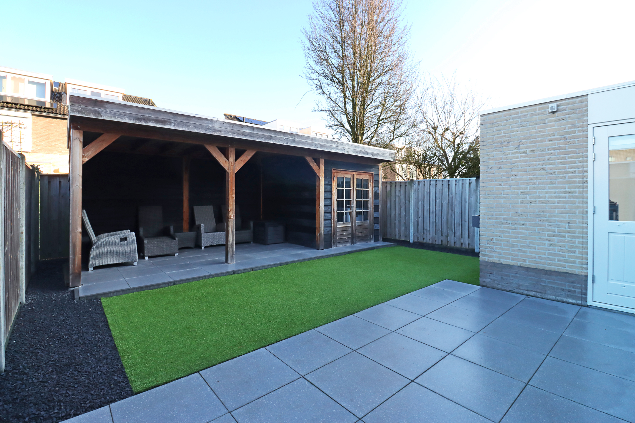 Buiten: Onderhoudsvriendelijke voortuin met siergrind. Bestrate oprit met carport en aangebouwde stenen berging/werkruimte naast de woning. De op het noorden gesitueerde achtertuin is volledig omsloten door tuinschermen, wat zorgt voor veel privacy. De tuin beschikt over een betegeld terras, kunstgras en een overkapte veranda met aansluitend een houten berging.