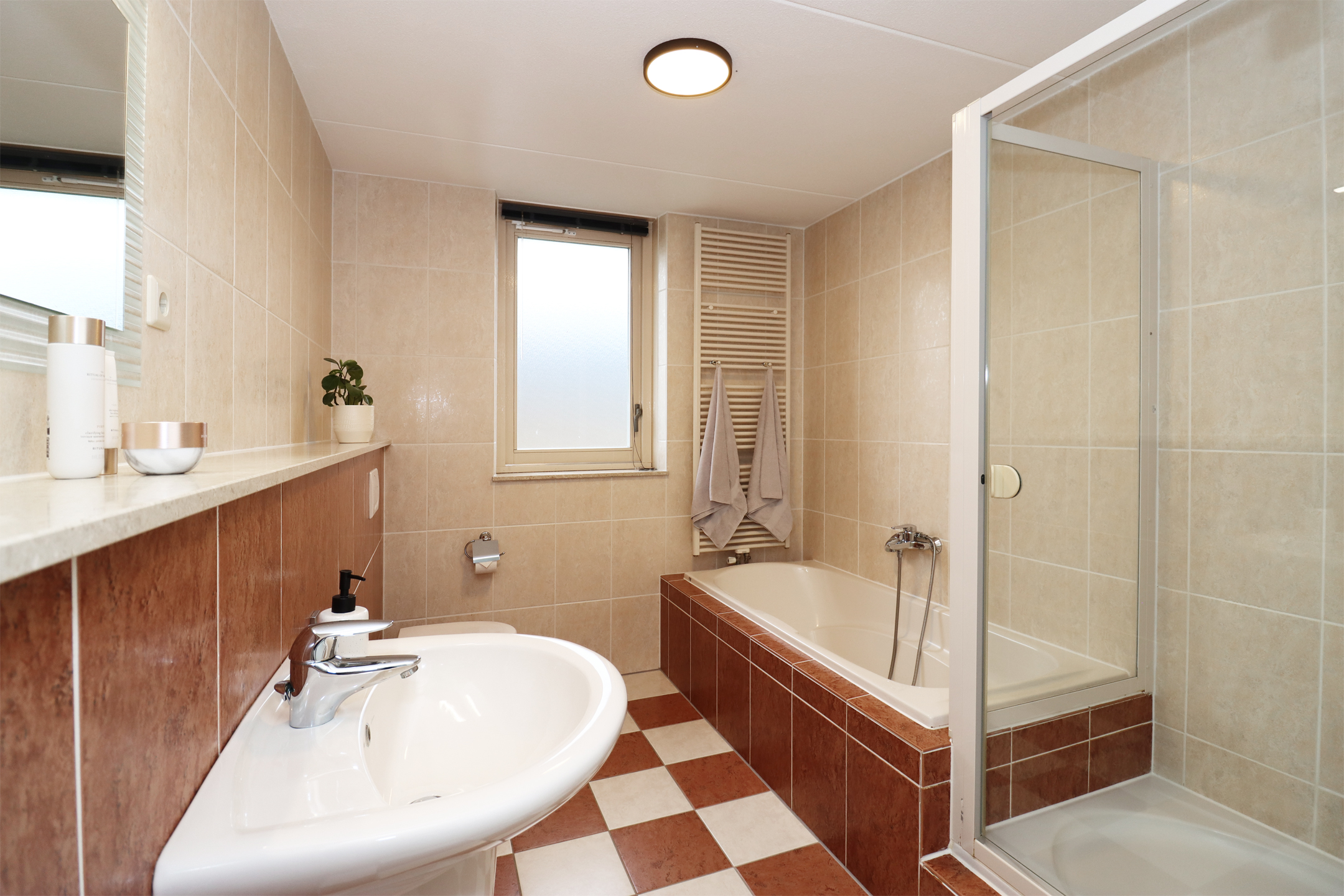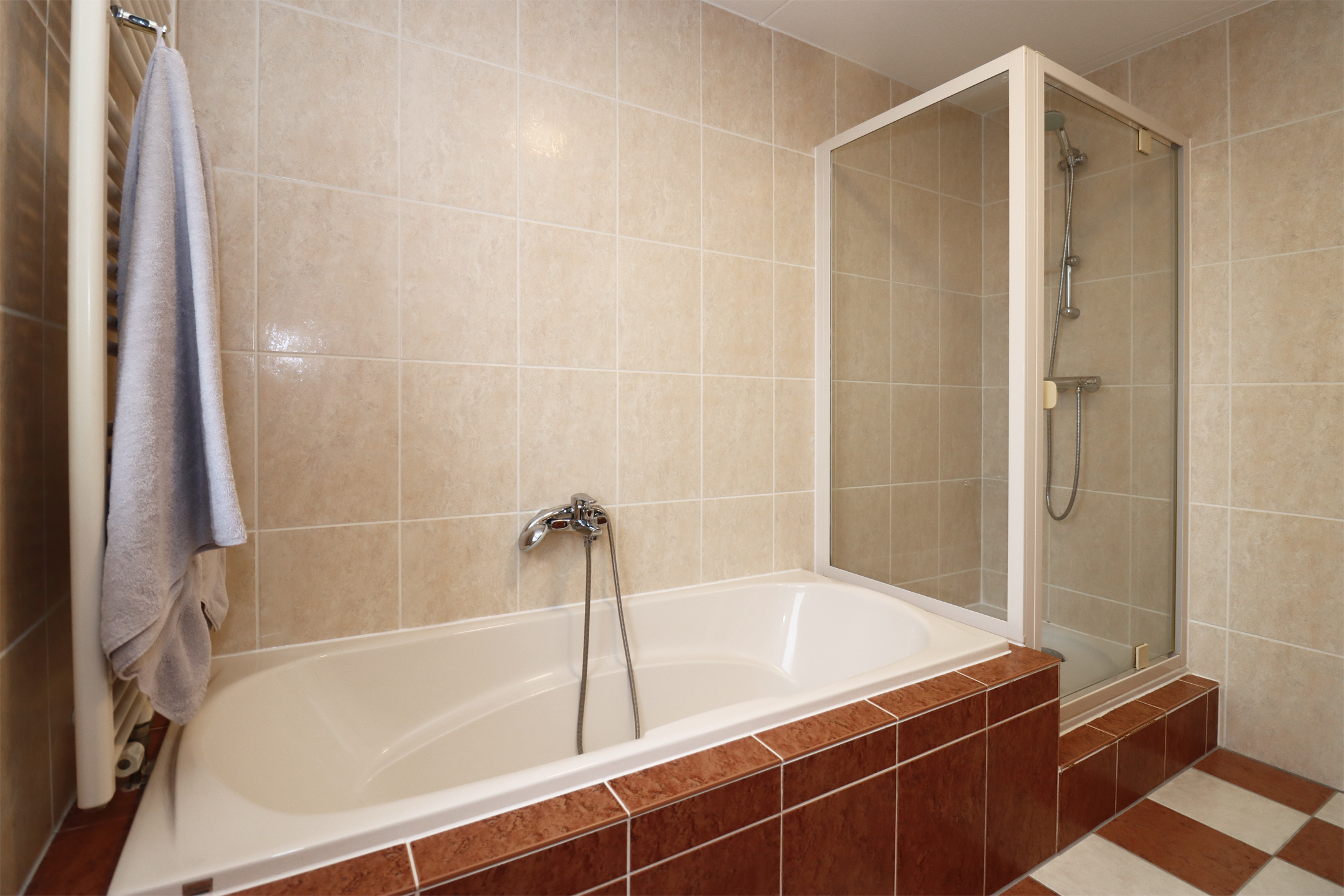 De badkamer is compleet uitgerust met een douchecabine, ligbad, wandcloset en wastafel.