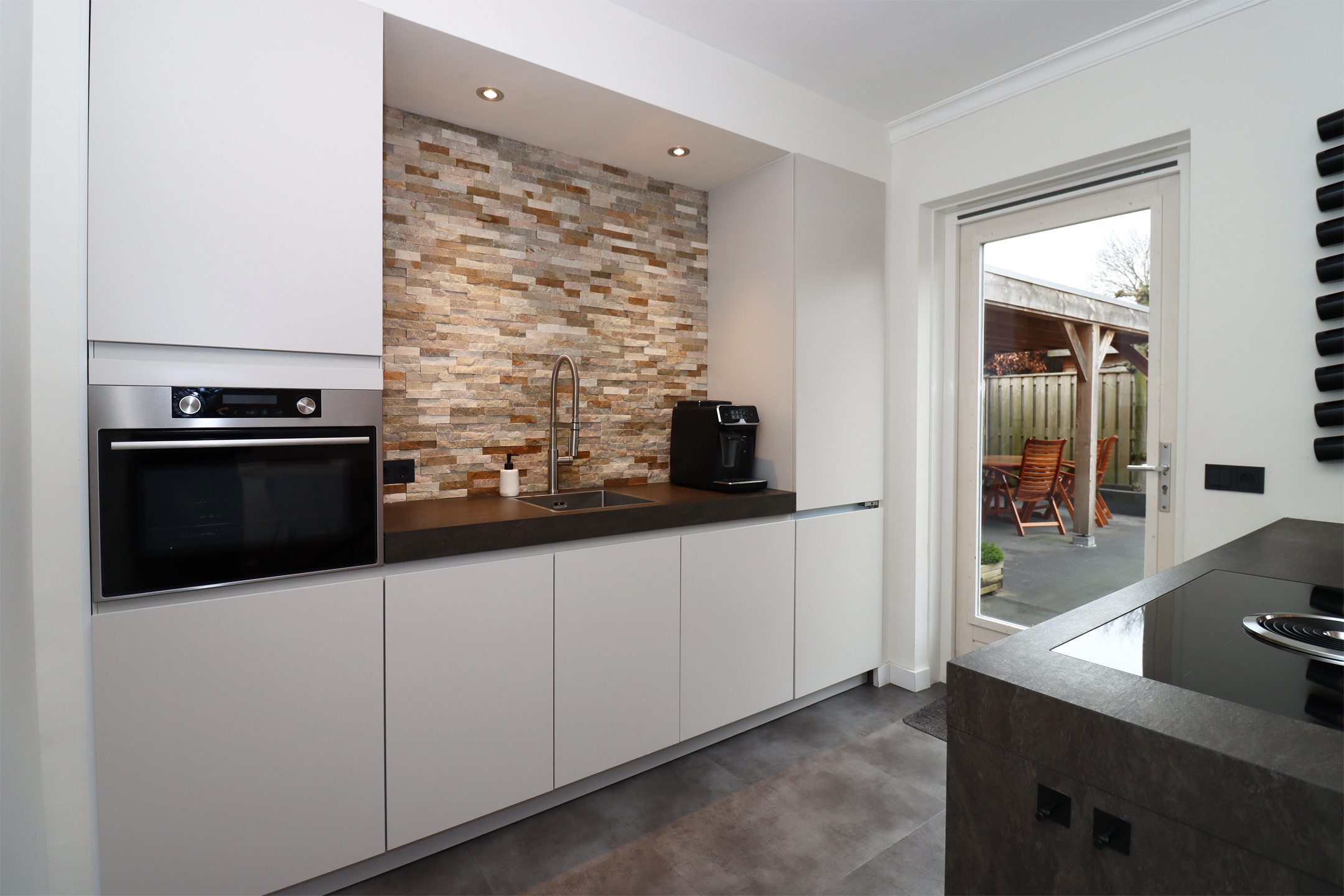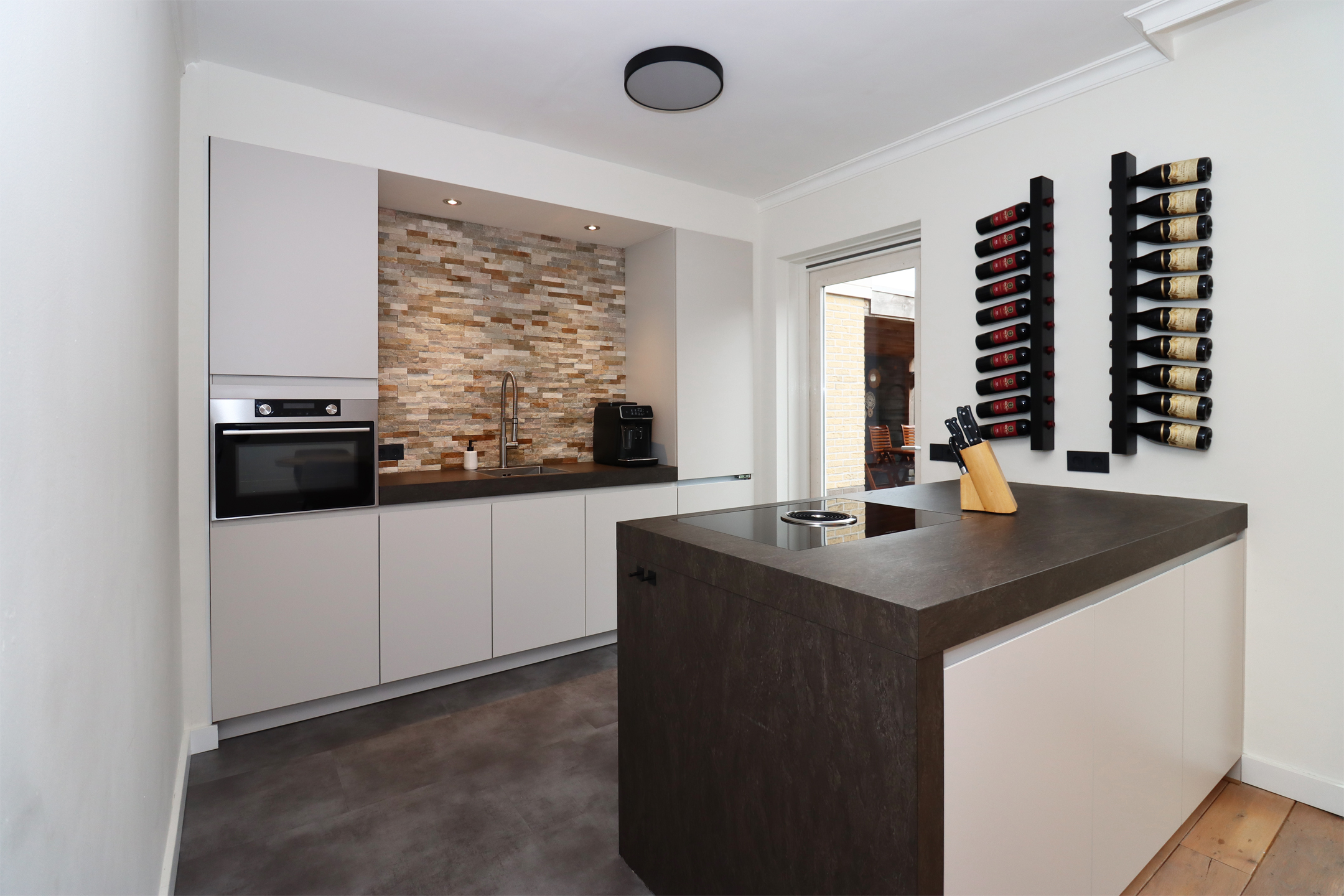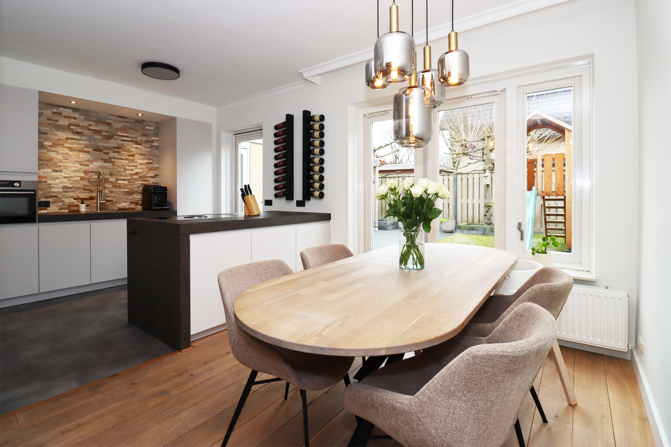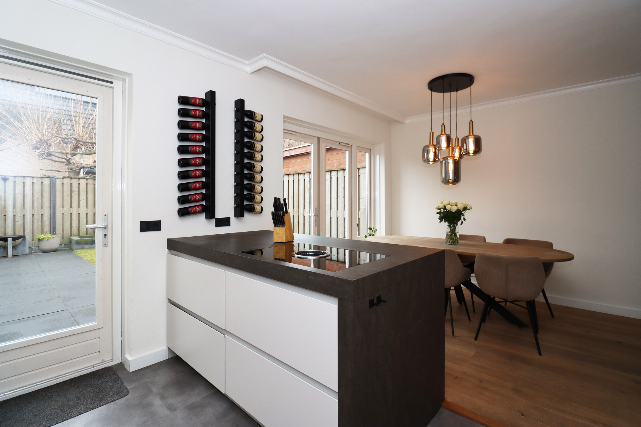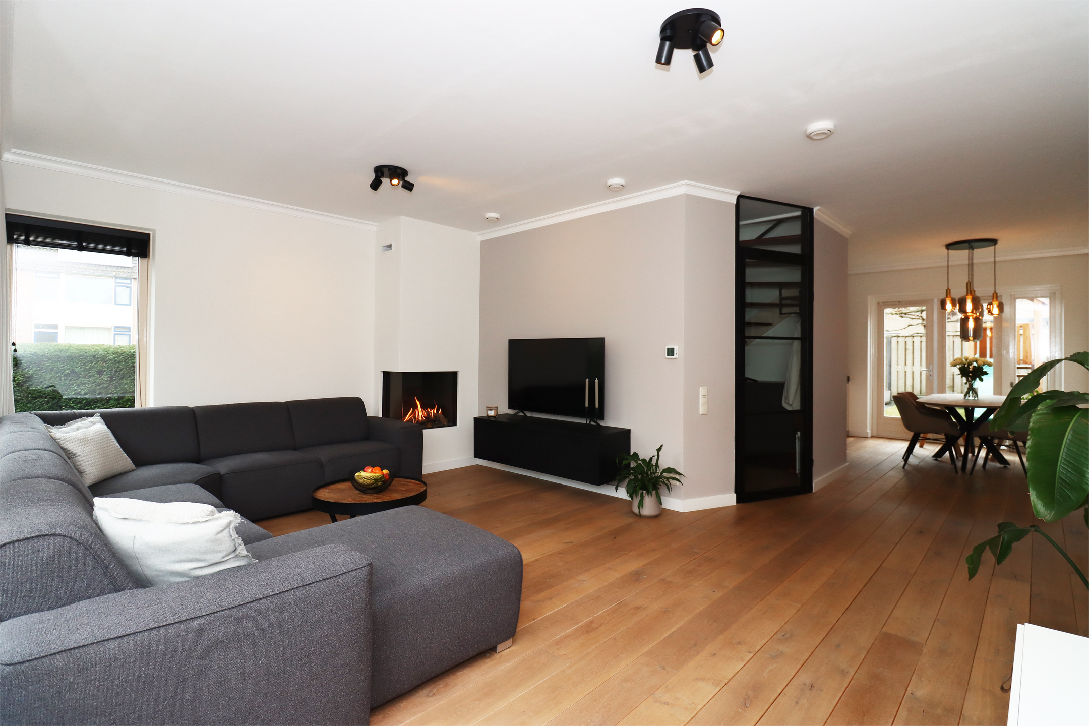 De ruime L-vormige woonkamer beschikt over een sfeervolle schouw met gashaard en grote raampartijen die zorgen voor veel lichtinval. In het eetgedeelte bevinden zich openslaande deuren naar het terras en de tuin. De open keuken heeft eveneens toegang tot het terras en is modern uitgevoerd met een wandopstelling met spoelgedeelte en een kookeiland, voorzien van diverse inbouwapparatuur.
