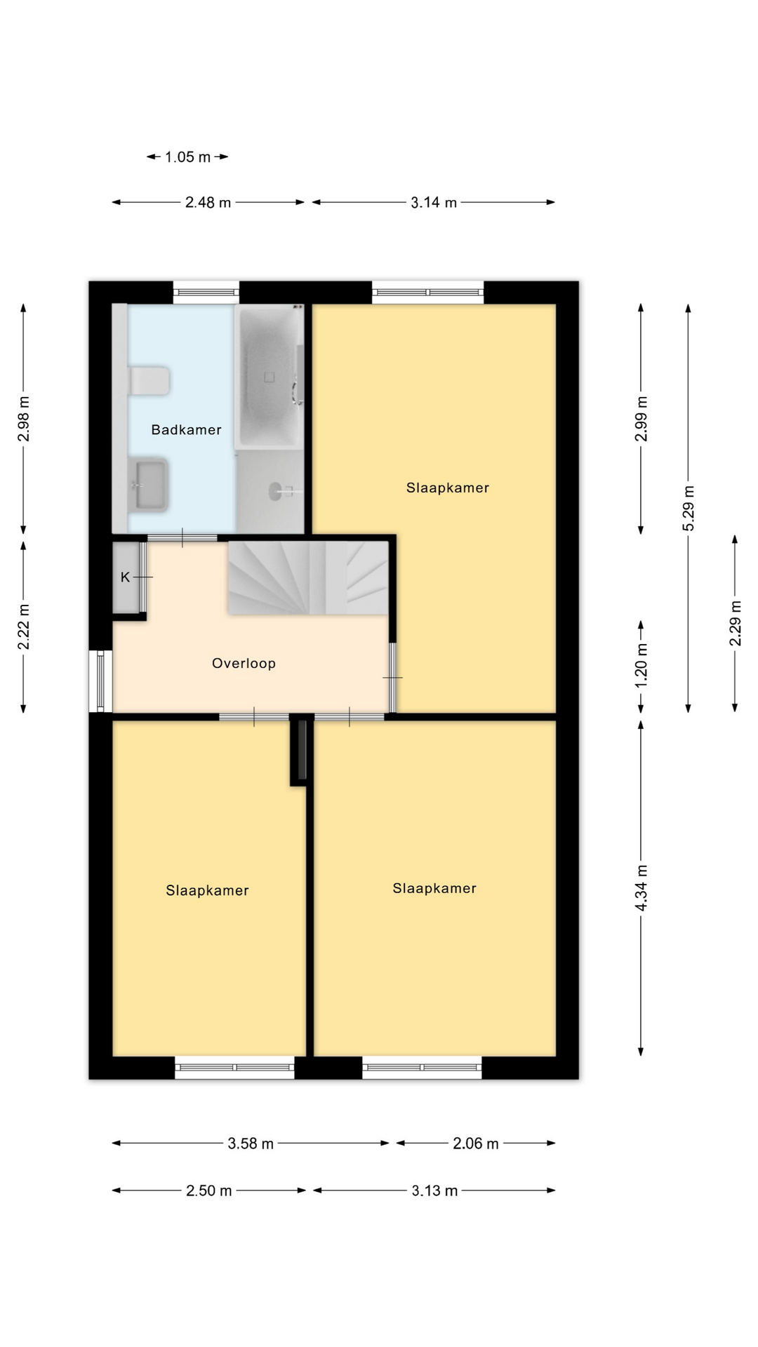 Overloop met gevelraam. Drie slaapkamers, waaronder een ruime master bedroom.